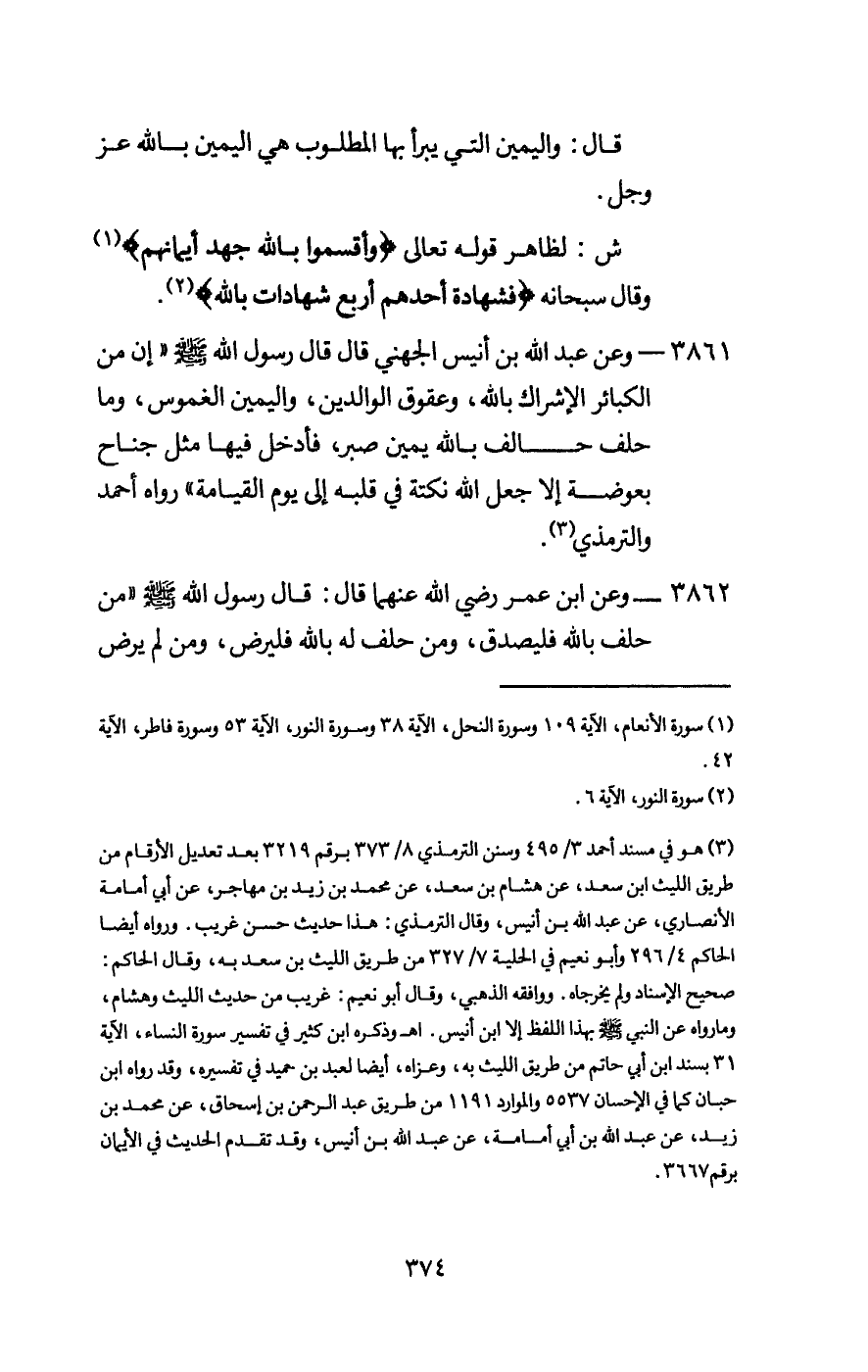 3861 - وعن عبد الله بن أنيس الجهني قال: قال رسول الله - صَلَّى اللَّهُ عَلَيْهِ وَسَلَّمَ - «إن من الكبائر الإشراك بالله، وعقوق الوالدين، واليمين الغموس، وما حلف حالف بالله يمين صبر، فأدخل فيها مثل جناح بعوضة إلا جعل الله نكتة في قلبه إلى يوم القيامة» رواه أحمد والترمذي.