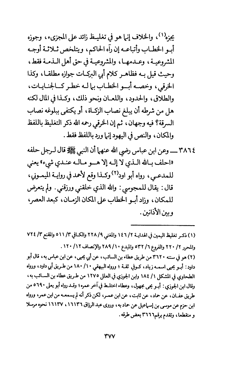 والخلاف إنما هو في تغليظ زائد على المجزئ، وجوزه أبو الخطاب وأتباعه إن رآه الحاكم، ويتلخص ثلاثة أوجه المشروعية، وعدمها، والمشروعية في حق أهل الذمة فقط، وحيث قيل به فظاهر كلام أبي البركات جوازه مطلقا، وكذا الخرقي، وخصه أبو الخطاب بما له خطر كالجنايات، والطلاق، والحدود، واللعان ونحو ذلك، وكذا في المال لكنه هل من شرطه أن يبلغ نصاب الزكاة، أو يكتفى ببلوغه نصاب السرقة؟ فيه وجهان، ثم إن الخرقي - رَحِمَهُ اللَّهُ - ذكر التغليظ باللفظ والمكان، والنص في اليهود إنما ورد باللفظ فقط.