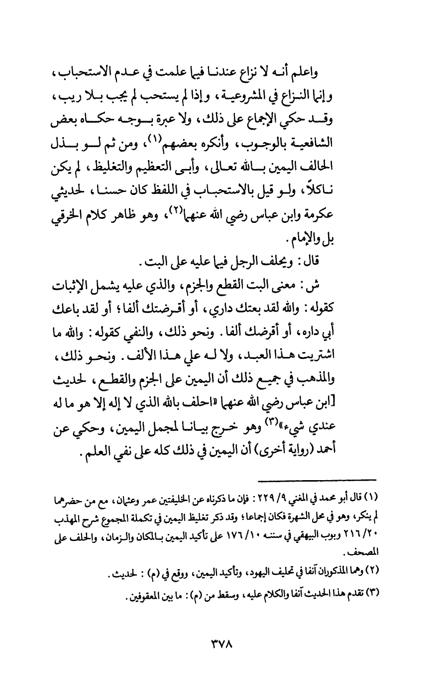 ونحو ذلك، والمذهب في جميع ذلك أن اليمين على الجزم والقطع، لحديث [ابن عباس - رَضِيَ اللَّهُ عَنْهُمَا - «احلف بالله الذي لا إله إلا هو ما له عندي شيء» وهو خرج بيانا لمجمل اليمين، وحكي عن أحمد (رواية أخرى) أن اليمين في ذلك كله على نفي العلم.