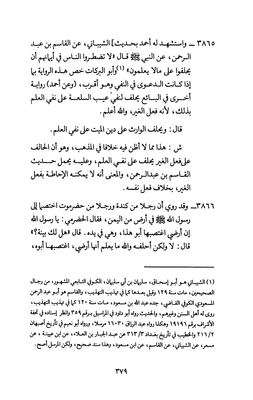 3865 - واستشهد له أحمد بحديث] الشيباني، عن القاسم بن عبد الرحمن، عن النبي - صَلَّى اللَّهُ عَلَيْهِ وَسَلَّمَ - قال: «لا تضطروا الناس في أيمانهم أن يحلفوا ما لا يعلمون» وأبو البركات خص هذه الرواية بما إذا كانت الدعوى في النفي وهو أقرب، (وعن أحمد) رواية أخرى في البائع يحلف لنفي عيب السلعة على نفي العلم بذلك، لأنه فعل الغير، والله أعلم.