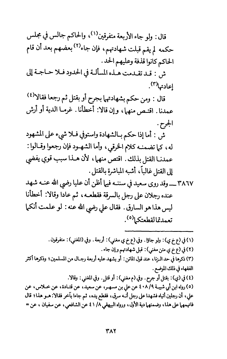 3867 - وقد روى سعيد في سننه فيما أظن أن عليا - رَضِيَ اللَّهُ عَنْهُ - شهد عنده رجلان على رجل بالسرقة فقطعه، ثم عادا وقالا: أخطأنا ليس هذا هو السارق.