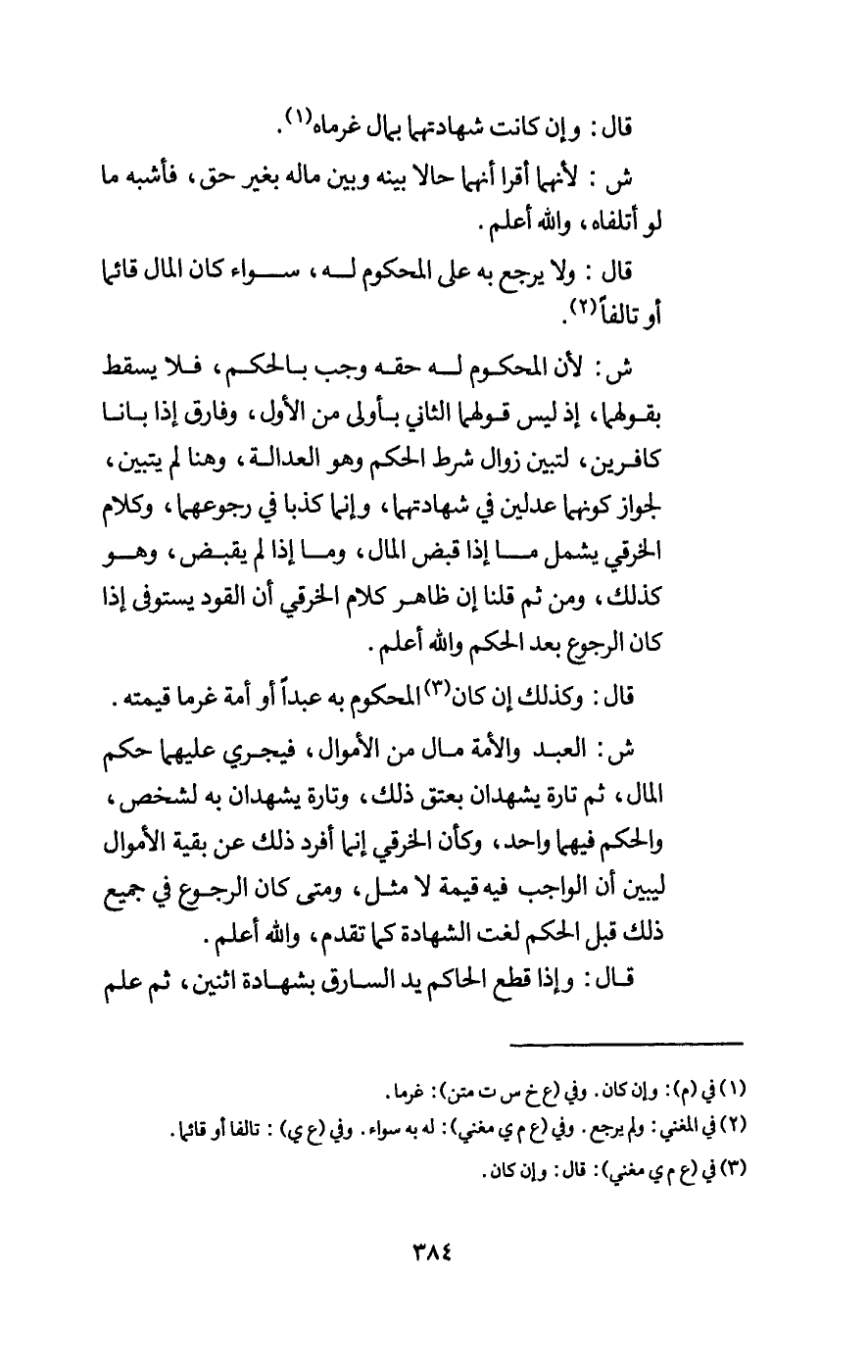 ش: العبد والأمة مال من الأموال، فيجري عليهما حكم المال، ثم تارة يشهدان بعتق ذلك، وتارة يشهدان به لشخص، والحكم فيهما واحد، وكأن الخرقي إنما أفرد ذلك عن بقية الأموال ليبين أن الواجب فيه قيمة لا مثل، ومتى كان الرجوع في جميع ذلك قبل الحكم لغت الشهادة كما تقدم، والله أعلم.