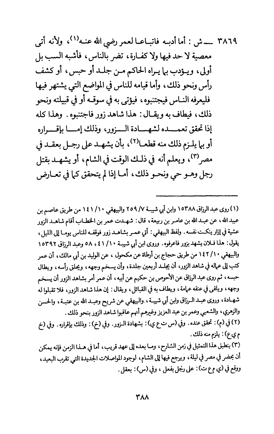 3869 - ش: أما أدبه فاتباعا لعمر - رَضِيَ اللَّهُ عَنْهُ -، ولأنه أتى معصية لا حد فيها ولا كفارة، تضر بالناس، فأشبه السب بل أولى، ويؤدب بما يراه الحاكم من جلد أو حبس، أو كشف رأس ونحو ذلك، وأما قيامه للناس في المواضع التي يشتهر فيها فليعرفه الناس فيجتنبوه، فيؤتى به في سوقه أو في قبيلته ونحو ذلك، فيطاف به ويقال: هذا شاهد زور فاجتنبوه.