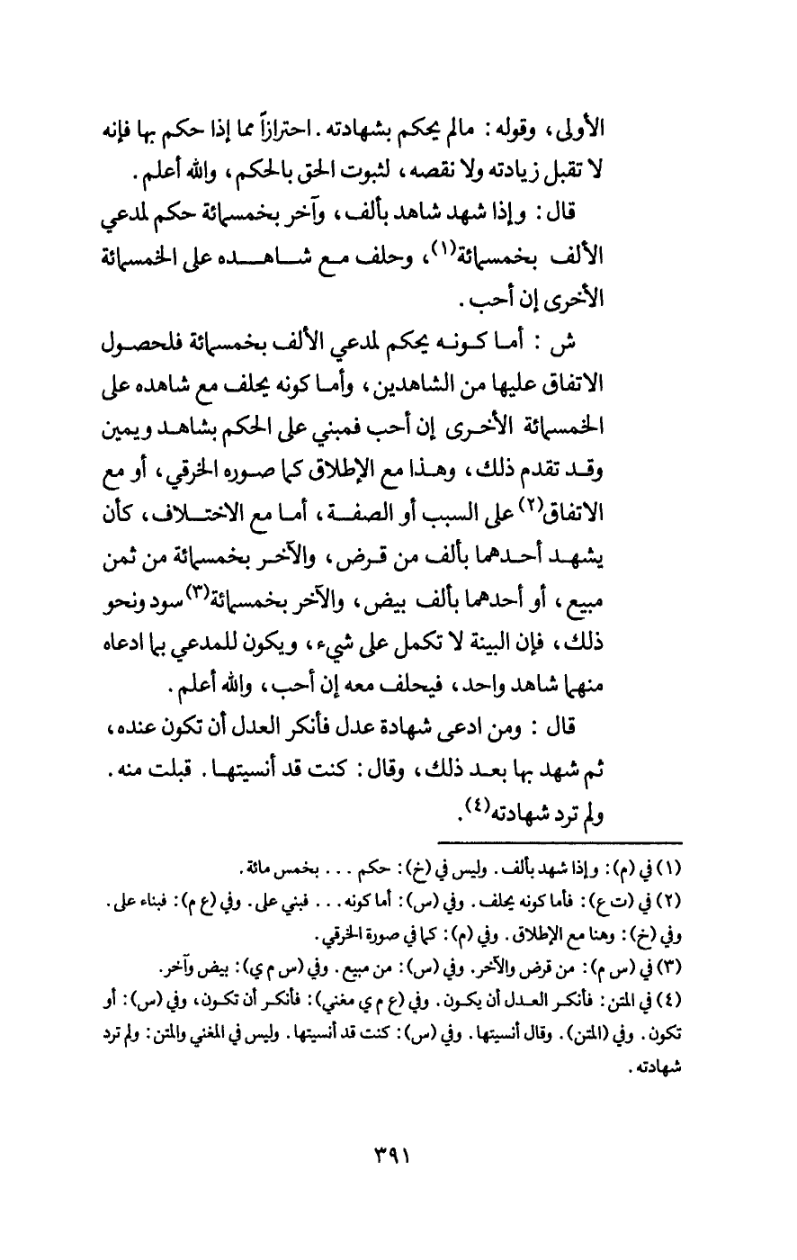 ش: أما كونه يحكم لمدعي الألف بخمسمائة فلحصول الاتفاق عليها من الشاهدين، وأما كونه يحلف مع شاهده على الخمسمائة الأخرى إن أحب فمبني على الحكم بشاهد ويمين وقد تقدم ذلك، وهذا مع الإطلاق كما صوره الخرقي، أو مع الاتفاق على السبب أو الصفة، أما مع الاختلاف، كأن يشهد أحدهما بألف من قرض، والآخر بخمسمائة من ثمن مبيع، أو أحدهما بألف بيض، والآخر بخمسمائة سود ونحو ذلك، فإن البينة لا تكمل على شيء، ويكون للمدعي بما ادعاه منهما شاهد واحد، فيحلف معه إن أحب، والله أعلم.