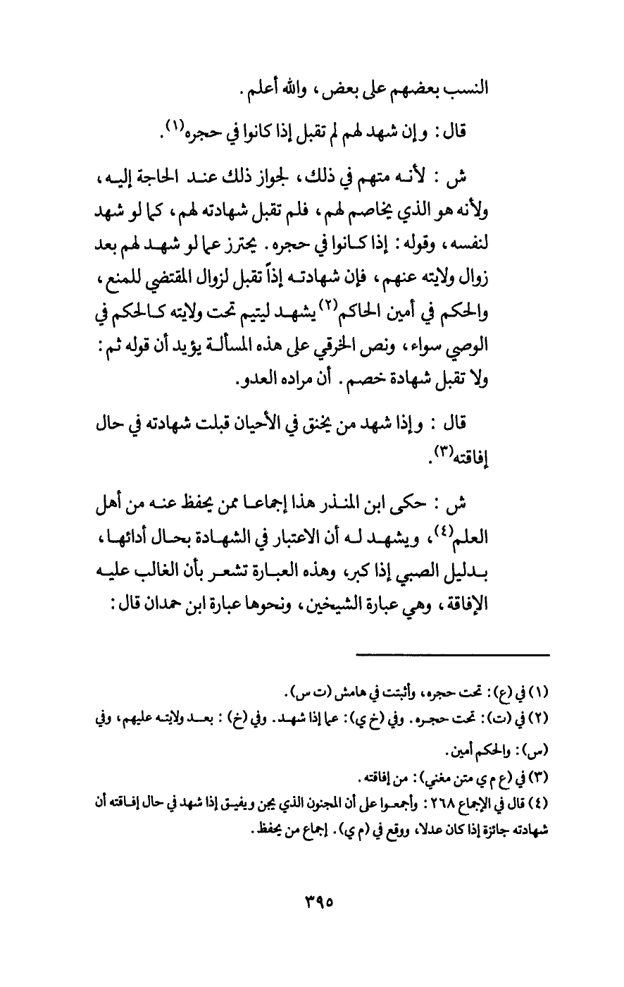 ش: حكى ابن المنذر هذا إجماعا ممن يحفظ عنه من أهل العلم، ويشهد له أن الاعتبار في الشهادة بحال أدائها، بدليل الصبي إذا كبر، وهذه العبارة تشعر بأن الغالب عليه الإفاقة، وهي عبارة الشيخين، ونحوها عبارة ابن حمدان قال: