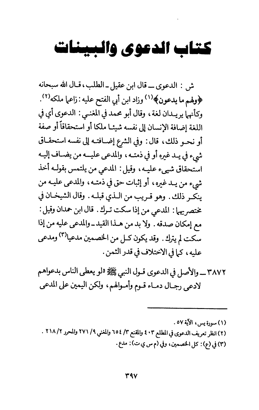 3872 - والأصل في الدعوى قول النبي - صَلَّى اللَّهُ عَلَيْهِ وَسَلَّمَ -: «لو يعطى الناس بدعواهم لادعى رجال دماء قوم وأموالهم، ولكن اليمين على المدعى