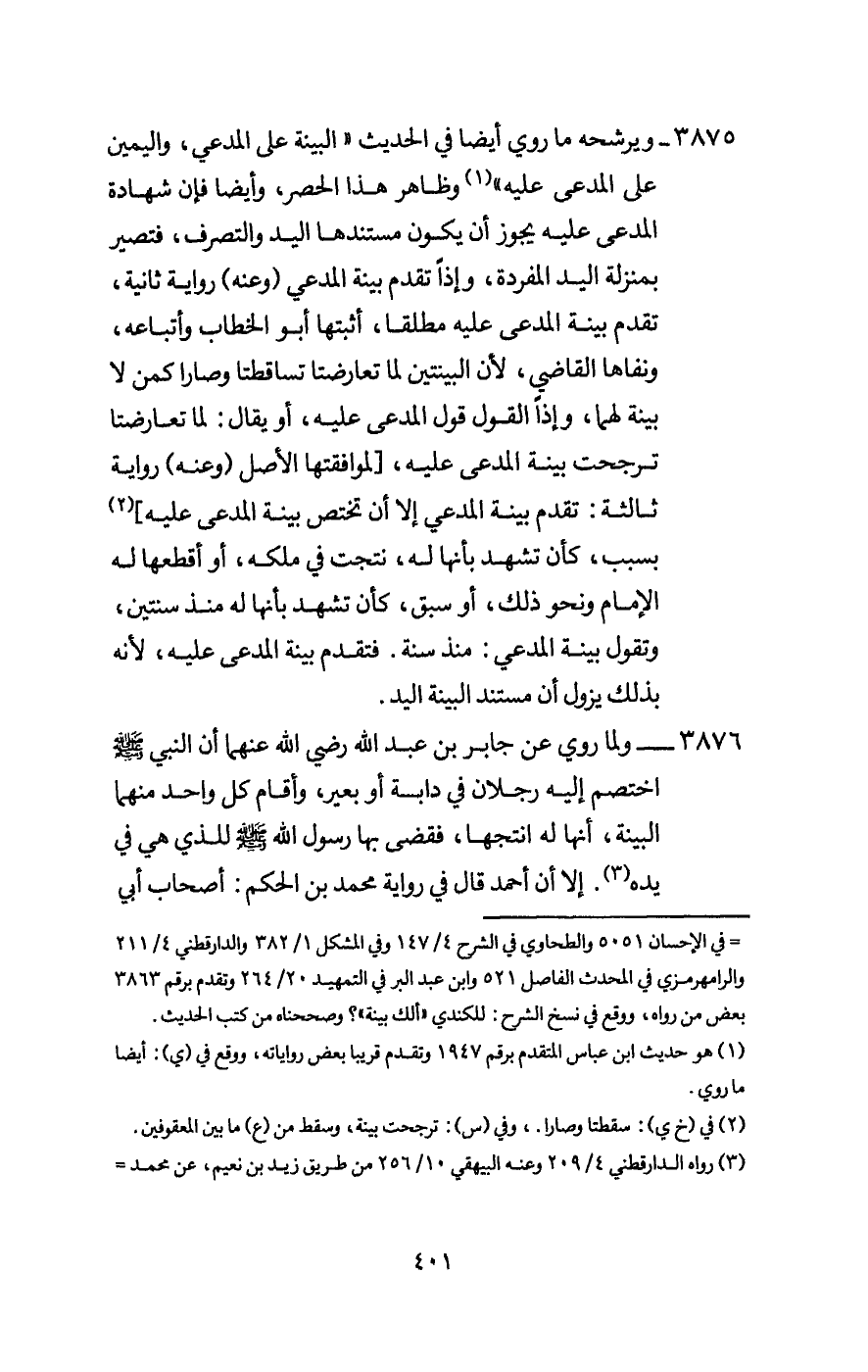 3876 - ولما «روي عن جابر بن عبد الله - رَضِيَ اللَّهُ عَنْهُمَا - أن النبي - صَلَّى اللَّهُ عَلَيْهِ وَسَلَّمَ - اختصم إليه رجلان في دابة أو بعير، وأقام كل واحد منهما البينة، أنها له أنتجها، فقضى بها رسول الله - صَلَّى اللَّهُ عَلَيْهِ وَسَلَّمَ - للذي هي في يده» . إلا أن أحمد قال في رواية محمد بن الحكم: أصحاب أبي