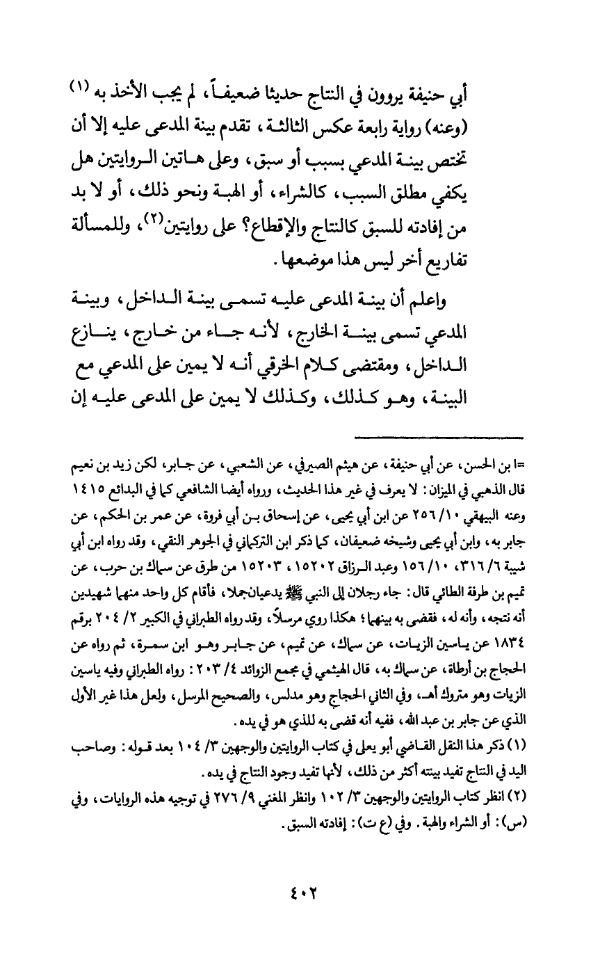 حنيفة يروون في النتاج حديثا ضعيفا، لم يجب الأخذ به (وعنه) رواية رابعة عكس الثالثة، تقدم بينة المدعى عليه إلا أن تختص بينة المدعي بسبب أو سبق، وعلى هاتين الروايتين هل يكفي مطلق السبب، كالشراء، أو الهبة ونحو ذلك، أو لا بد من إفادته للسبق كالنتاج والإقطاع؟ على روايتين، وللمسألة تفاريع أخر ليس هذا موضعها.