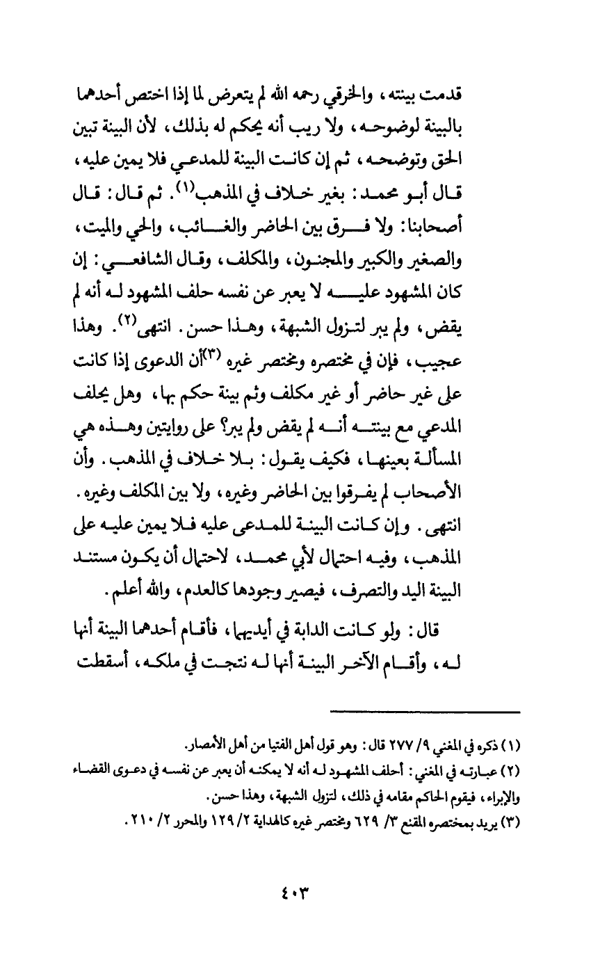 قدمت بينته، والخرقي - رَحِمَهُ اللَّهُ - لم يتعرض لما إذا اختص أحدهما بالبينة لوضوحه، ولا ريب أن يحكم له بذلك، لأن البينة تبين الحق وتوضحه، ثم إن كانت البينة للمدعي فلا يمين عليه، قال أبو محمد: بغير خلاف في المذهب. ثم قال: قال أصحابنا: ولا فرق بين الحاضر والغائب، والحي والميت، والصغير والكبير والمجنون، والمكلف، وقال الشافعي: إن كان المشهود عليه لا يعبر عن نفسه حلف المشهود له أنه لم يقض، ولم يبر لتزول الشبهة، وهذا حسن. انتهى، وهذا عجيب، فإن في مختصره ومختصر غيره أن الدعوى إذا كانت على غير حاضر أو غير مكلف وثم بينة حكم بها، وهل يحلف المدعي مع بينته أنه لم يقض ولم يبر؟ على روايتين وهذه هي المسألة بعينها، فكيف يقول: بلا خلاف في المذهب. وأن الأصحاب لم يفرقوا بين الحاضر وغيره، ولا بين المكلف وغيره. انتهى. وإن كانت البينة للمدعى عليه فلا يمين عليه على المذهب، وفيه احتمال لأبي محمد، لاحتمال أن يكون مستند البينة اليد والتصرف، فيصير وجودها كالعدم، والله أعلم.