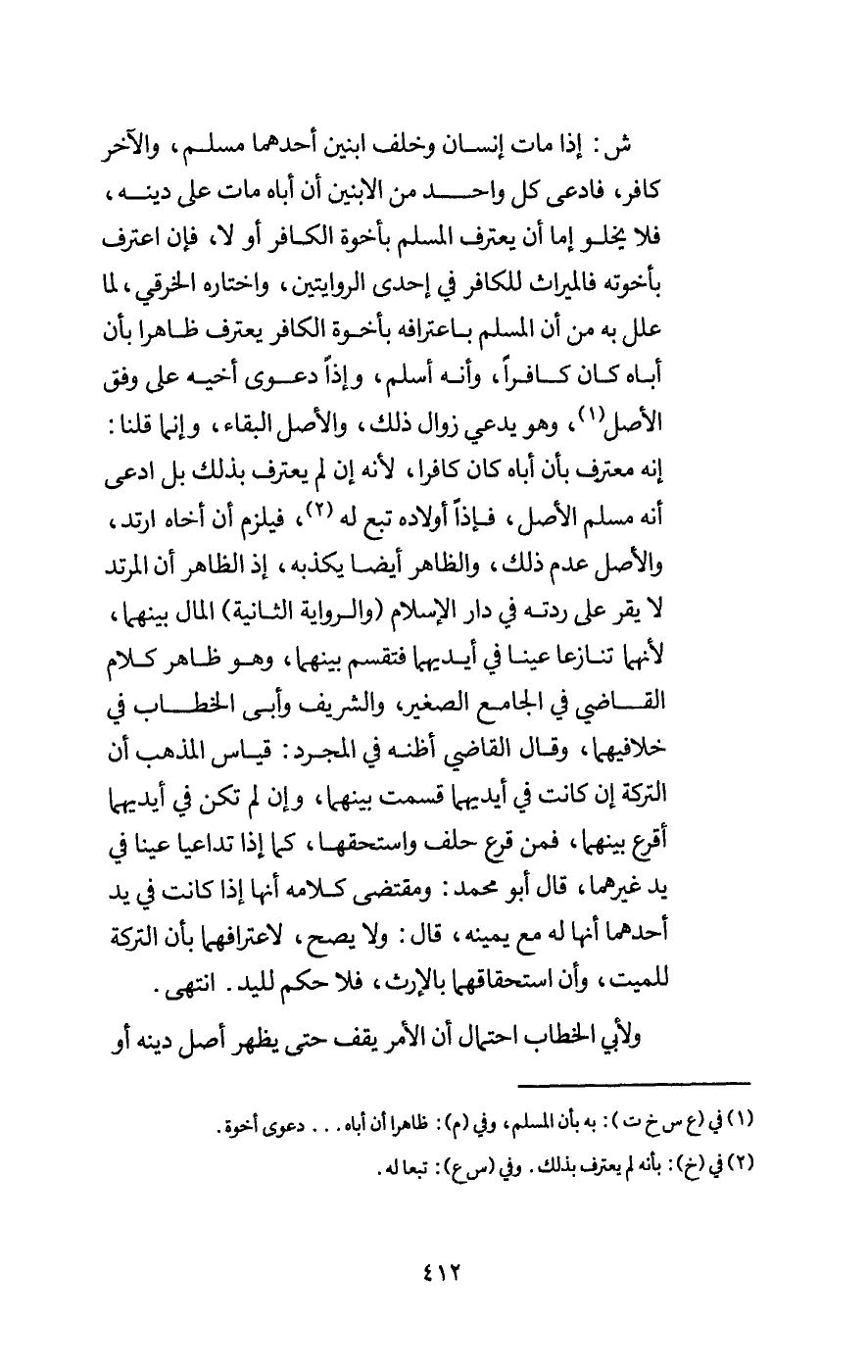 ش: إذا مات إنسان وخلف ابنين أحدهما مسلم، والآخر كافر، فادعى كل واحد من الابنين أن أباه مات على دينه فلا يخلو إما أن يعترف المسلم بأخوة الكافر أو لا، فإن اعترف بأخوته فالميراث للكافر في إحدى الروايتين، واختاره الخرقي، لما علل به من أن المسلم باعترافه بأخوة الكافر يعترف ظاهرا بأن أباه كان كافرا، وأنه أسلم، وإذا دعوى أخيه على وفق الأصل، وهو يدعي زوال ذلك، والأصل البقاء، وإنما قلنا: إنه معترف بأن أباه كان كافرا، لأنه إن لم يعترف بذلك بل ادعى أنه مسلم الأصل، فإذا أولاده تبع له، فيلزم أن أخاه ارتد، والأصل عدم ذلك، والظاهر أيضا يكذبه، إذ الظاهر أن المرتد لا يقر على ردته في دار الإسلام (والرواية الثانية) المال بينهما، لأنهما تنازعا عينا في أيديهما فتقسم بينهما، وهو ظاهر كلام القاضي في الجامع الصغير، والشريف وأبي الخطاب في خلافيهما، وقال القاضي أظنه في المجرد: قياس المذهب أن التركة إن كانت في أيديهما قسمت بينهما، وإن لم تكن في أيديهما أقرع بينهما، فمن قرع حلف واستحقها، كما إن تداعيا عينا في يد غيرهما، وقال أبو محمد: ومقتضى كلامه أنها إذا كانت في يد أحدهما أنها له مع يمينه، قال: ولا يصح، لاعترافهما بأن التركة للميت، وأن استحقاقهما بالإرث، فلا حكم لليد. انتهى.