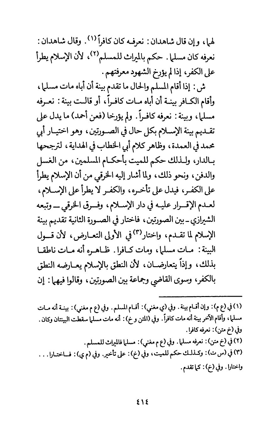 ش: إذا أقام المسلم والحال ما تقدم بينة أن أباه مات مسلما، وأقام الكافر بينة أن أباه مات كافرا، أو قالت بينة: نعرفه مسلما، وبينة: نعرفه كافرا، ولم يؤرخا (فعن أحمد) ما يدل على تقديم بينة الإسلام بكل حال في الصورتين، وهو اختيار أبي محمد في العمدة، وظاهر كلام أبي الخطاب في الهداية لترجحها بالدار، ولذلك حكم للميت بأحكام المسلمين، من الغسل والدفن، ونحو ذلك، ولما أشار إليه الخرقي من أن الإسلام يطرأ على الكفر، فيدل على تأخره، والكفر لا يطرأ على الإسلام، لعدم الإقرار عليه في دار الإسلام، وفرق الخرقي - وتبعه الشيرازي - بين الصورتين فاختار في الصورة الثانية تقديم بينة الإسلام لما تقدم، واختار في الأولى التعارض، لأن قول البينة: مات مسلما، ومات كافرا، ظاهره أنه مات ناطقا بذلك، وإذا يتعارضان، لأن النطق بالإسلام يعارضه النطق بالكفر، وسوى القاضي وجماعة بين الصورتين، وقالوا فيهما: إن
