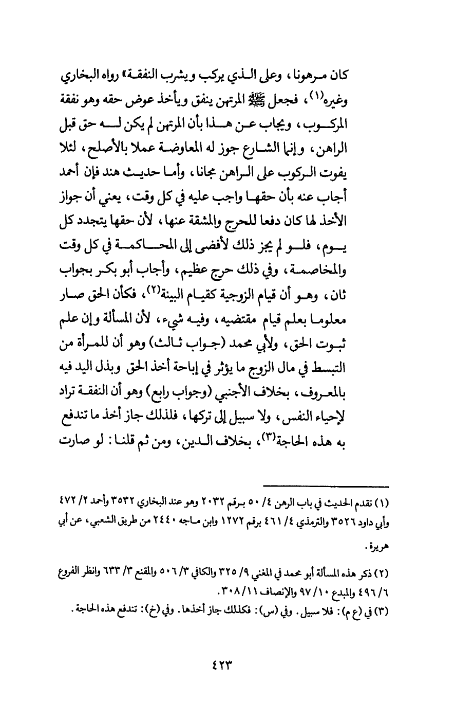 كان مرهونا، وعلى الذي يركب ويشرب النفقة» رواه البخاري وغيره، فجعل - صَلَّى اللَّهُ عَلَيْهِ وَسَلَّمَ - المرتهن ينفق ويأخذ عوض حقه وهو نفقة المركوب، ويجاب عن هذا بأن المرتهن لم يكن له حق قبل الراهن، وإنما الشارع جوز له المعاوضة عملا بالأصلح، لئلا يفوت الركوب على الراهن مجانا، وأما حديث هند فإن أحمد أجاب عنه بأن حقها واجب عليه في كل وقت، يعني أن جواز الأخذ لها كان دفعا للحرج والمشقة عنها، لأن حقها يتجدد كل يوم، فلو لم يجز ذلك لأفضى إلى المحاكمة في كل وقت والمخاصمة، وفي ذلك حرج عظيم، وأجاب أبو بكر بجواب ثان، وهو أن قيام الزوجية كقيام البينة، فكأن الحق صار معلوما بعلم قيام مقتضيه، وفيه شيء، لأن المسألة وإن علم ثبوت الحق، ولأبي محمد (جواب ثالث) وهو أن للمرأة من التبسط في مال الزوج ما يؤثر في إباحة أخذ الحق وبذل اليد فيه بالمعروف، بخلاف الأجنبي (وجواب الرابع) وهو أن النفقة تراد لإحياء النفس، ولا سبيل إلى تركها، فلذلك جاز أخذ ما تندفع به هذه الحاجة، بخلاف الدين، ومن ثم قلنا: لو صارت