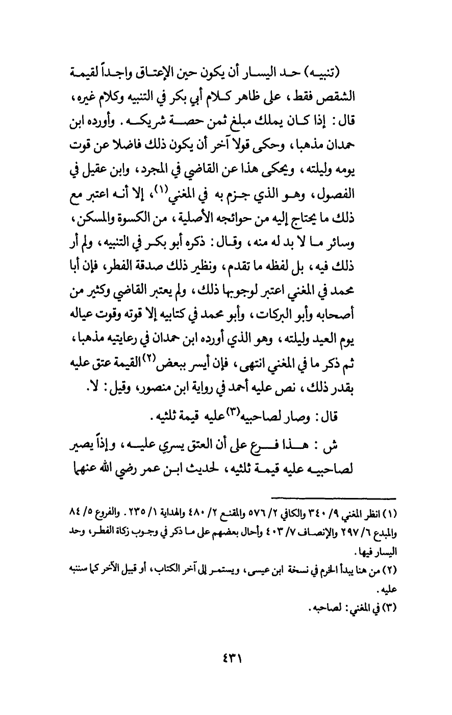 (تنبيه) حد اليسار أن يكون حين الإعتاق واجدا لقيمة الشقص فقط، على ظاهر كلام أبي بكر في التنبيه وكلام غيره، قال: إذا كان يملك مبلغ ثمن حصة شريكه، وأورده ابن حمدان مذهبا، وحكى قولا آخر أن يكون ذلك فاضلا عن قوت يومه وليلته، ويحكى هذا عن القاضي في المجرد، وابن عقيل في الفصول، وهو الذي جزم به في المغني، إلا أنه اعتبر مع ذلك ما يحتاج إليه من حوائجه الأصلية، من الكسوة والمسكن، وسائر ما لا بد له منه، وقال: ذكره أبو بكر في التنبيه، ولم أر ذلك فيه، بل لفظه ما تقدم، ونظير ذلك صدقة الفطر، فإن أبا محمد في المغني اعتبر لوجوبها ذلك، ولم يعتبر القاضي وكثير من أصحابه وأبو البركات، وأبو محمد في كتابيه إلا قوته وقوت عياله يوم العيد وليلته، وهو الذي أورده ابن حمدان في رعايتيه مذهبا، ثم ذكر ما في المغني انتهى، فإن أيسر ببعض القيمة عتق عليه بقدر ذلك، نص عليه أحمد في رواية ابن منصور، وقيل: لا.