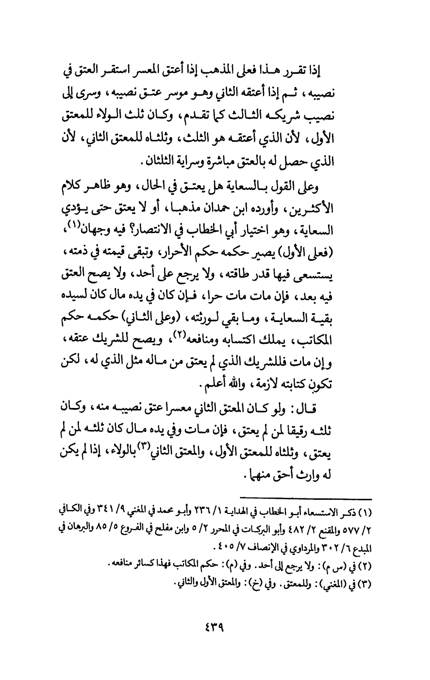 وعلى القول بالسعاية هل يعتق في الحال، وهو ظاهر كلام الأكثرين، وأورده ابن حمدان مذهبا، أو لا يعتق حتى يؤدي السعاية، وهو اختيار أبي الخطاب في الانتصار؟ فيه وجهان، (فعلى الأول) يصير حكمه حكم الأحرار، وتبقى قيمته في ذمته، يستسعى فيها قدر طاقته، ولا يرجع على أحد، ولا يصح العتق فيه بعد، فإن مات مات حرا، فإن كان في يده مال كان لسيده بقية السعاية، وما بقي لورثته، (وعلى الثاني) حكمه حكم المكاتب، يملك اكتسابه ومنافعه، ويصح للشريك عتقه، وإن مات فللشريك الذي لم يعتق من ماله مثل الذي له، لكن تكون كتابته لازمة، والله أعلم.