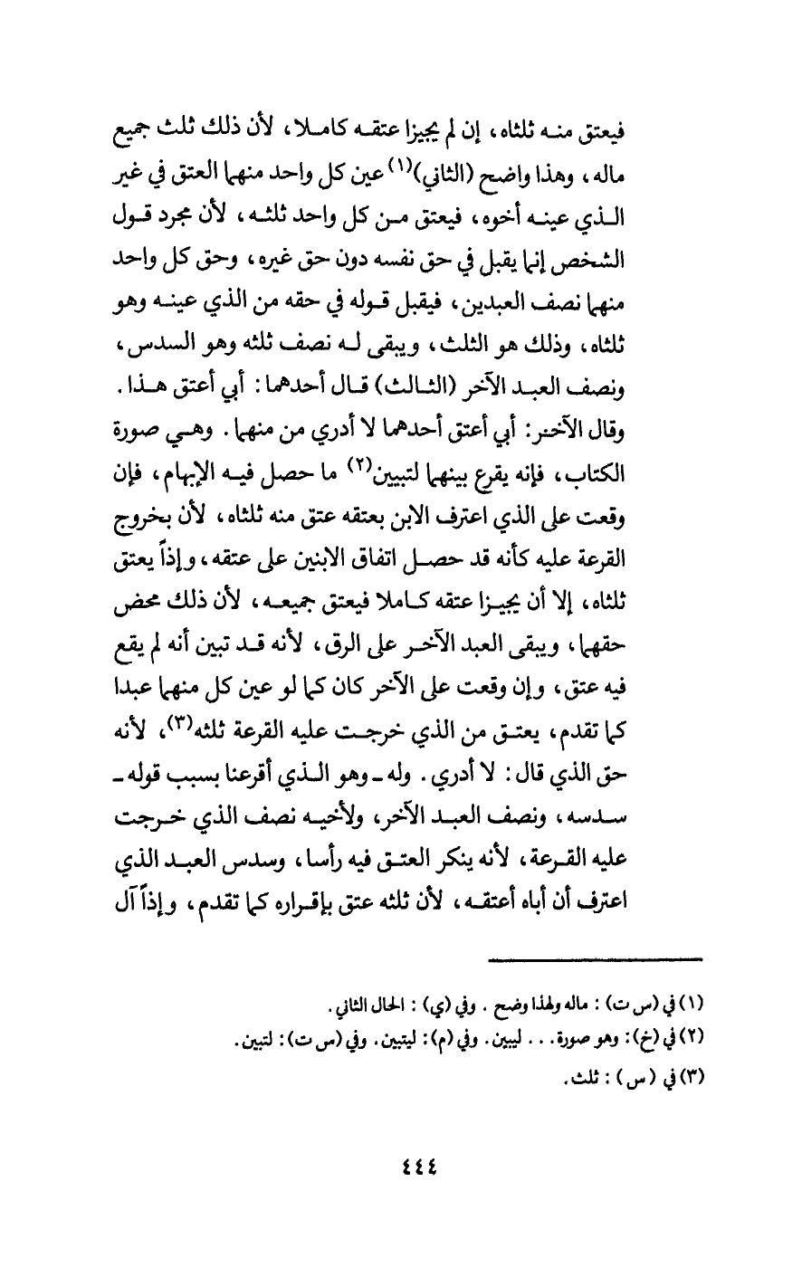 فيعتق منه ثلثاه، إن لم يجيزا عتقه كاملا، لأن ذلك ثلث جميع ماله، وهذا واضح (الثاني) عين كل واحد منهما العتق في غير الذي عينه أخوه، فيعتق من كل واحد ثلثه، لأن مجرد قول الشخص إنما يقبل في حق نفسه دون حق غيره، وحق كل واحد منهما نصف العبدين، فيقبل قوله في حقه من الذي عينه وهو ثلثاه، وذلك هو الثلث، ويبقى له نصف ثلثه وهو السدس، ونصف العبد الآخر (الثالث) قال أحدهما: أبي أعتق هذا. وقال الآخر: أبي أعتق أحدهما لا أدري من منهما. وهي صورة الكتاب، فإنه يقرع بينهما لتبيين ما حصل فيه الإبهام، فإن وقعت على الذي اعترف الابن بعتقه عتق منه ثلثاه، لأن بخروج القرعة عليه كأنه قد حصل اتفاق الابنين على عتقه، وإذا يعتق ثلثاه، إلا أن يجيزا عتقه كاملا فيعتق جميعه، لأن ذلك محض حقهما، ويبقى العبد الآخر على الرق، لأنه قد تبين أنه لم يقع في عتق، وإن وقعت على الآخر كان كما لو عين كل منهما عبدا كما تقدم، يعتق من الذي خرجت عليه القرعة ثلثه، لأنه حق الذي قال: لا أدري. وله - وهو الذي أقرعنا بسبب قوله - سدسه، ونصف العبد الآخر، ولأخيه نصف الذي خرجت عليه القرعة، لأنه ينكر العتق فيه رأسا وسدس العبد الذي اعترف أن أباه أعتقه، لأن ثلثه عتق بإقراره كما تقدم، وإذا آل