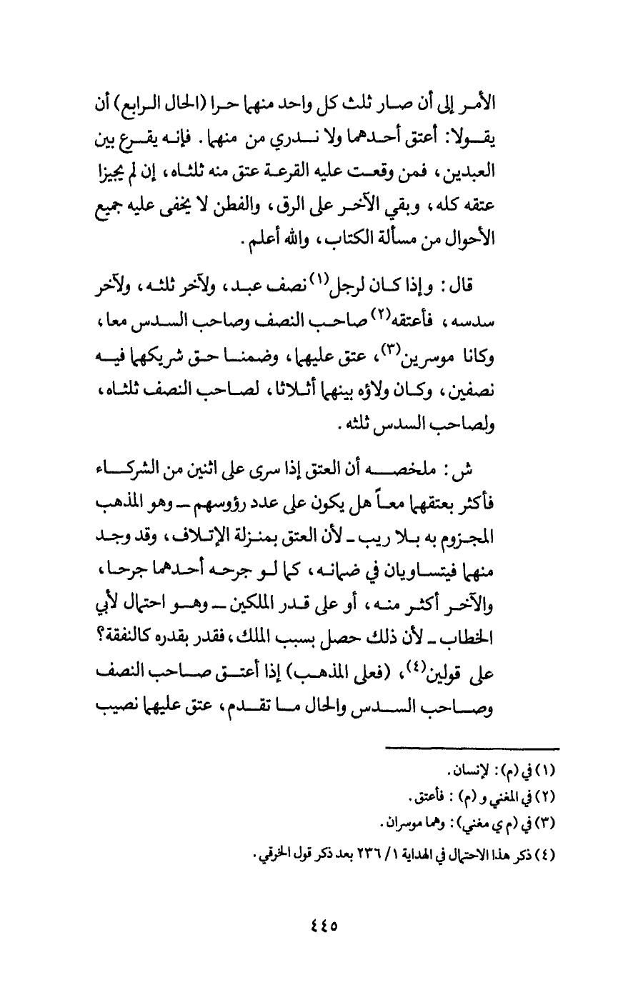 الأمر إلى أن صار ثلث كل واحد منهما حرا (الحال الرابع) أن يقولا: أعتق أحدهما ولا ندري من منهما. فإنه يقرع بين العبدين، فمن وقعت عليه القرعة عتق منه ثلثاه، إن لم يجيزا عتقه كله، وبقي الآخر على الرق، والفطن لا يخفى عليه جميع الأحوال من مسألة الكتاب، والله أعلم.