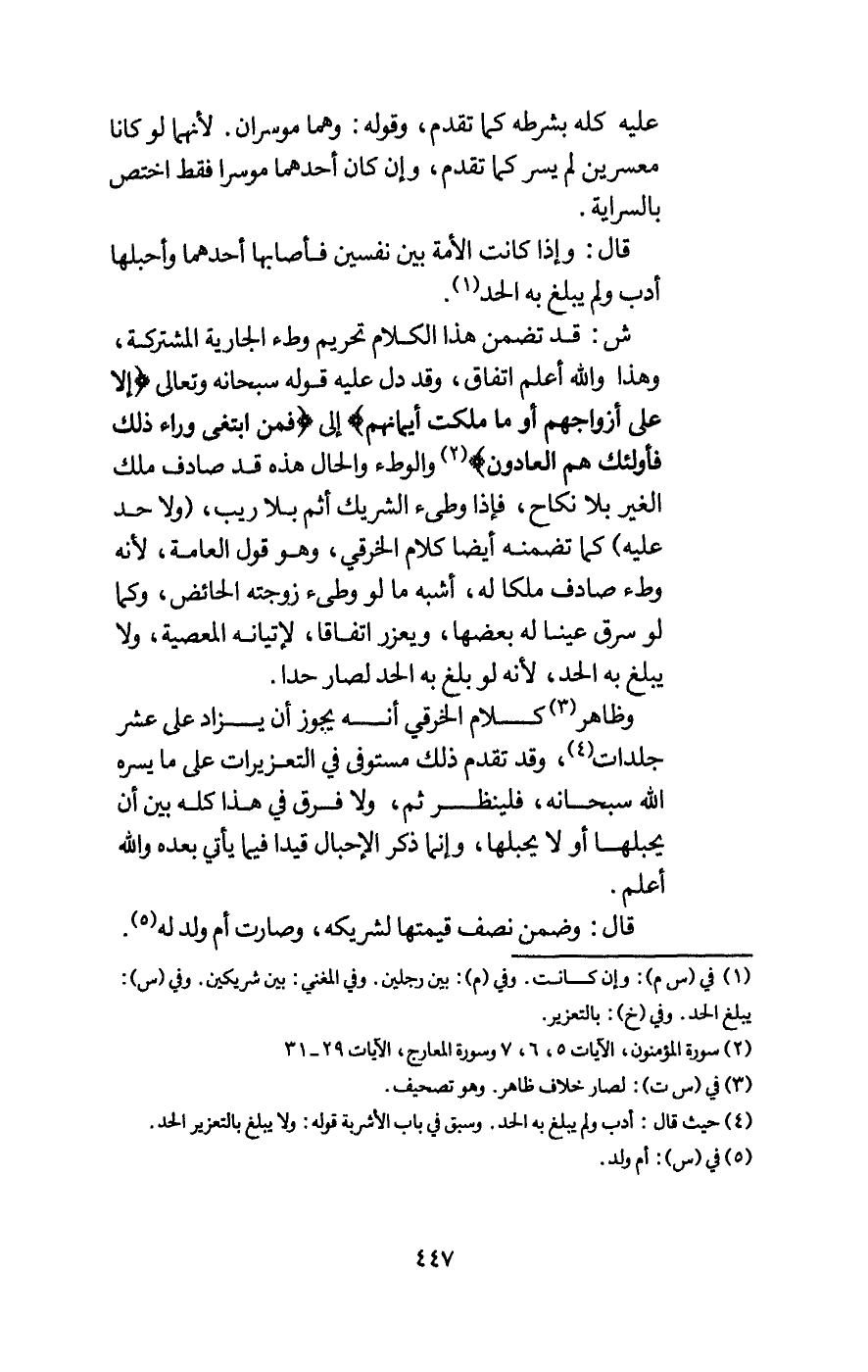 ش: قد تضمن هذا الكلام تحريم وطء الجارية المشتركة وهذا والله أعلم اتفاق، وقد دل عليه قوله سبحانه وتعالى: {إِلَّا عَلَى أَزْوَاجِهِمْ أوْ مَا مَلَكَتْ أَيْمَانُهُمْ} [المؤمنون: 6] إلى {فَمَنِ ابْتَغَى وَرَاءَ ذَلِكَ فَأُولَئِكَ هُمُ الْعَادُونَ} [المؤمنون: 7] والوطء والحال هذه قد صادف ملك الغير بلا نكاح، فإذا وطئ الشريك أثم بلا ريب، (ولا حد عليه) كما تضمنه أيضا كلام الخرقي، وهو قول العامة، لأنه وطء صادف ملكا له، أشبه ما لو وطئ زوجته الحائض، وكما لو سرق عينا له بعضها، ويعزر اتفاقا، لإتيانه، المعصية، ولا يبلغ به الحد، لأنه لو بلغ به الحد لصار حدا.