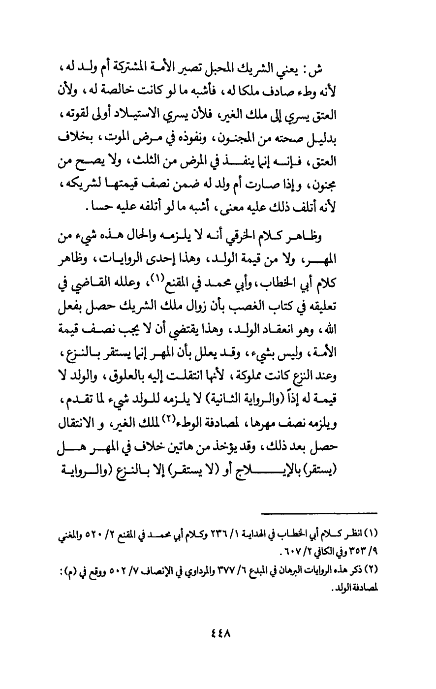 وظاهر كلام الخرقي أنه لا يلزمه والحال هذه شيء من المهر، ولا من قيمة الولد، وهذا إحدى الروايات، وظاهر كلام أبي الخطاب، وأبي محمد في المقنع، وعلله القاضي في تعليقه في كتاب الغصب بأن زوال ملك الشريك حصل بفعل الله، وهو انعقاد الولد، وهذا يقتضي أن لا يجب نصف قيمة الأمة، وليس بشيء، وقد يعلل بأن المهر إنما يستقر بالنزع، وعند النزع كانت مملوكة، لأنها انتقلت إليه بالعلوق، والولد لا قيمة له إذا (والرواية الثانية) لا يلزمه للولد شيء لما تقدم، ويلزمه نصف مهرها، لمصادفة الوطء لملك الغير، والانتقال حصل بعد ذلك، وقد يؤخذ من هاتين خلاف المهر هل (يستقر) بالإيلاج أو (لا يستقر) إلا بالنزع (والرواية