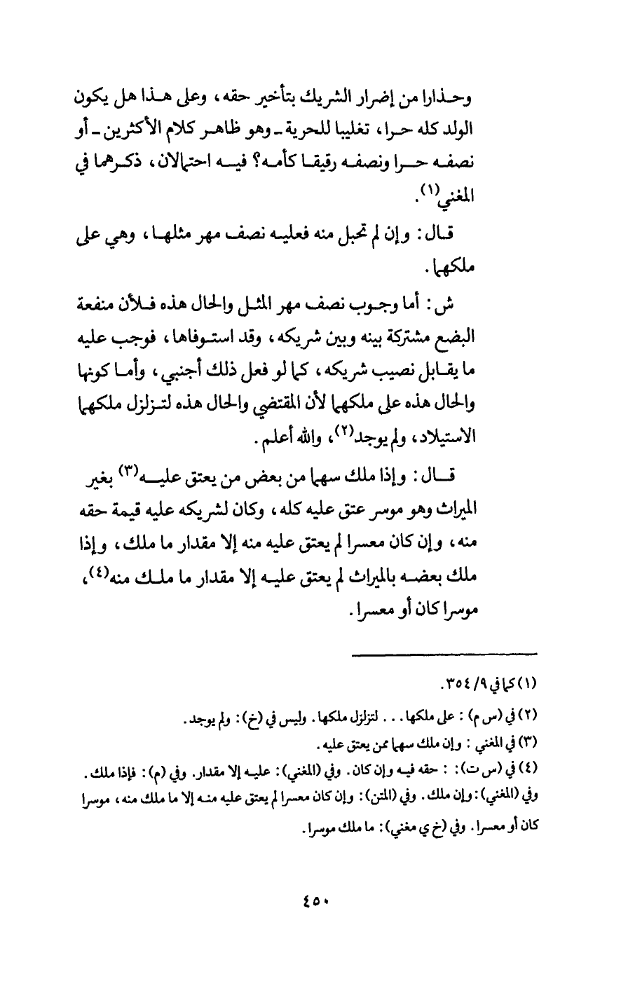 وحذارا من إضرار الشريك بتأخير حقه، وعلى هذا هل يكون الولد كله حرا، تغليبا للحرية - وهو ظاهر كلام الأكثرين - أو نصفه حرا ونصفه رقيقا كأمه؟ فيه احتمالان، ذكرهما في المغني.