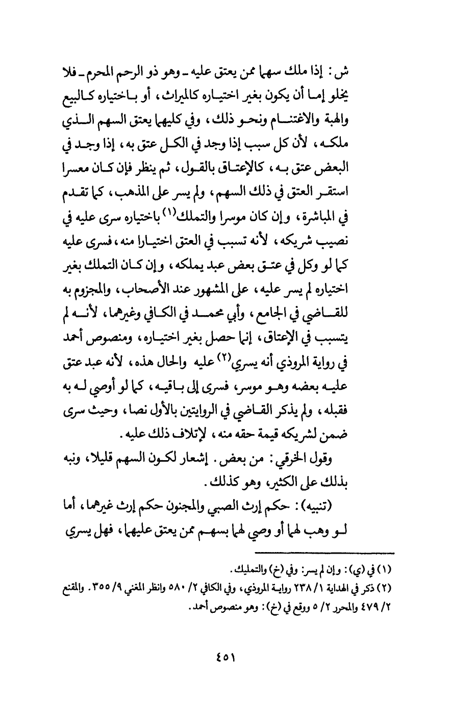 ش: إذا ملك سهما ممن يعتق عليه - وهو ذو الرحم المحرم - فلا يخلو إما أن يكون بغير اختياره كالميراث، أو باختياره كالبيع والهبة والاغتنام ونحو ذلك، وفي كليهما يعتق السهم الذي ملكه، لأن كل سبب إذا وجد في الكل عتق به، إذا وجد في البعض عتق به، كالإعتاق بالقول، ثم ينظر فإن كان معسرا استقر العتق في ذلك السهم، ولم يسر على المذهب، كما تقدم في المباشرة، وإن كان موسرا والتملك باختياره سرى عليه في نصيب شريكه، لأنه تسبب في العتق اختيارا منه، فسرى عليه كما لو وكل في عتق بعض عبد يملكه، وإن كان التملك بغير اختياره لم يسر عليه، على المشهور عند الأصحاب، والمجزوم به للقاضي في الجامع، وأبي محمد في الكافي وغيرهما، لأنه لم يتسبب في الإعتاق، إنما حصل بغير اختياره، ومنصوص أحمد في رواية المروذي أنه يسري عليه والحال هذه، لأنه عبد عتق عليه بعضه وهو موسر، فسرى إلى باقيه، كما لو أوصي له به فقبله، ولم يذكر القاضي في الروايتين بالأول نصا، وحيث سرى ضمن لشريكه قيمة حقه منه، لإتلاف ذلك عليه.