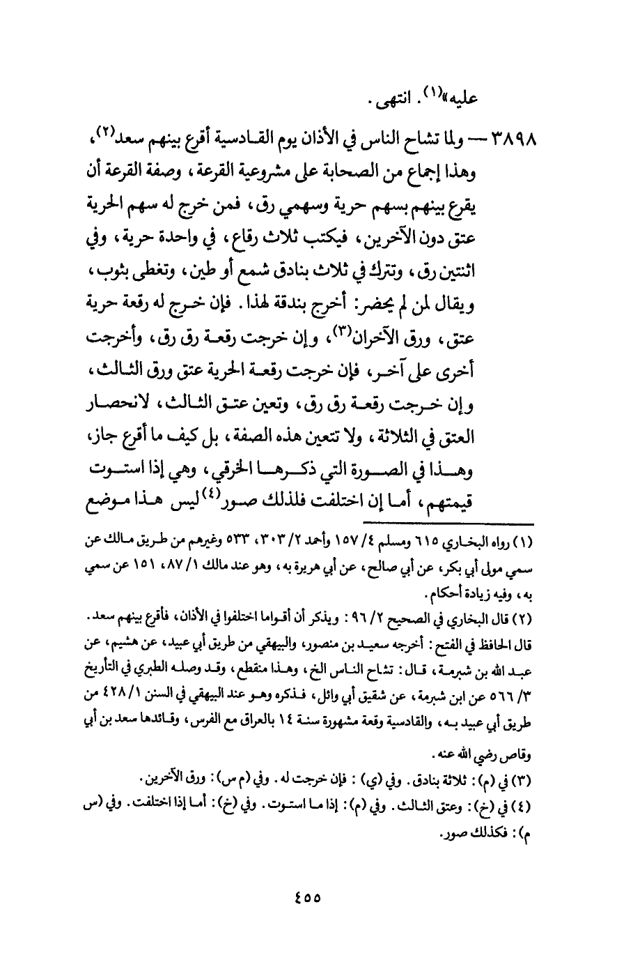 3898 - ولما تشاح الناس في الأذان يوم القادسية أقرع بينهم سعد، وهذا إجماع من الصحابة على مشروعية القرعة، وصفة القرعة أن يقرع بينهم بسهم حرية وسهمي رق، فمن خرج له سهم الحرية عتق دون الآخرين، فيكتب ثلاث رقاع، في واحدة حرية، وفي اثنتين رق، وتترك في ثلاث بنادق شمع أو طين، وتغطى بثوب، ويقال لمن لم يحضر: أخرج بندقة لهذا، فإن خرج له رقعة حرية عتق، ورق الآخران، وإن خرجت رقعة رق رق، وأخرجت أخرى على آخر، فإن خرجت رقعة الحرية عتق ورق الثالث، وإن خرجت رقعة رق رق، وتعين عتق الثالث، لانحصار العتق في الثلاثة، ولا تتعين هذه الصفة، بل كيف ما أقرع جاز، وهذا في الصورة التي ذكرها الخرقي، وهي إذا استوت قيمتهم، أما إن اختلفت فلذلك صور ليس هذا موضع