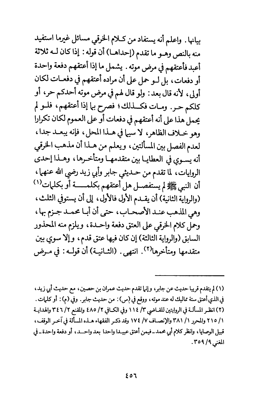 بيانها. واعلم أنه يستفاد من كلام الخرقي مسائل غير ما استفيد منه بالنص وهو ما تقدم (إحداها) أن قوله: إذا كان له ثلاثة أعبد فأعتقهم في مرض موته. يشمل ما إذا أعتقهم دفعة واحدة أو دفعات، بل لو حمل على أن مراده أعتقهم في دفعات لكان أولى، لأنه قال بعد: ولو قال لهم في مرض موته: أحدكم حر، أو كلكم حر. ومات فكذلك؛ فصرح بما إذا أعتقهم، فلو لم يحمل هذا على أنه أعتقهم في دفعات أو على العموم لكان تكرارا وهو خلاف الظاهر، لا سيما في هذا المحل، فإنه يبعد جدا، لعدم الفصل بين المسألتين، ويعلم من هذا أن مذهب الخرقي أنه يسوي في العطايا بين متقدمها ومتأخرها، وهذا إحدى الروايات، لما تقدم من حديثي جابر وأبي زيد - رَضِيَ اللَّهُ عَنْهُمَا -، أن النبي - صَلَّى اللَّهُ عَلَيْهِ وَسَلَّمَ - لم يستفصل هل أعتقهم بكلمة أو بكلمات (والرواية الثانية) أن يقدم الأول فالأول، إلى أن يستوفي الثلث، وهي المذهب عند الأصحاب، حتى إن أبا محمد جزم بها، وحمل كلام الخرقي على العتق دفعة واحدة، ويلزم منه المحذور السابق (والرواية الثالثة) إن كان فيها عتق قدم، وإلا سوي بين متقدمها ومتأخرها. انتهى. (الثانية) أن قوله: في مرض