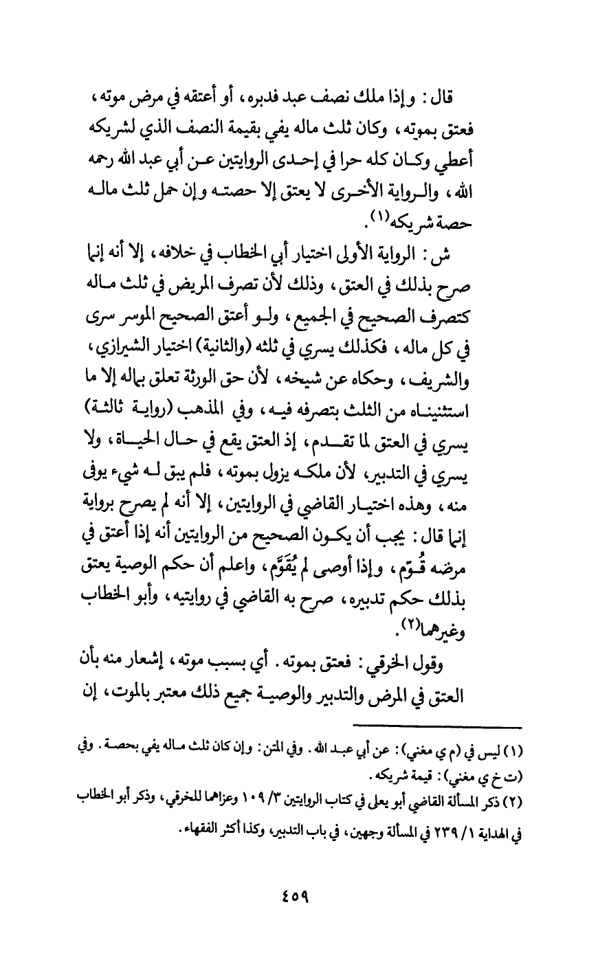 قال: وإذا ملك نصف عبد فدبره، أو أعتقه في مرض موته، فعتق بموته، وكان ثلث ماله يفي بقيمة النصف الذي لشريكه أعطي وكان كله حرا في إحدى الروايتين عن أبي عبد الله - رَحِمَهُ اللَّهُ -، والرواية الأخرى لا يعتق إلا حصته وإن حمل ثلث ماله حصة شريكه.