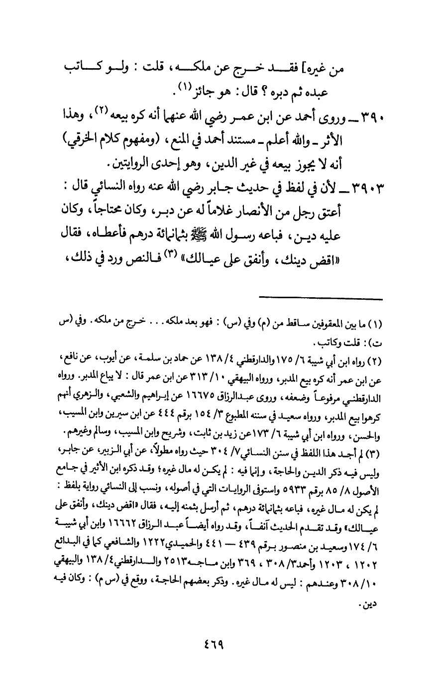 3903 - لأن في لفظ في حديث جابر - رَضِيَ اللَّهُ عَنْهُ - رواه النسائي قال: «أعتق رجل من الأنصار غلاما له عن دبر، وكان محتاجا، وكان عليه دين، فباعه رسول الله - صَلَّى اللَّهُ عَلَيْهِ وَسَلَّمَ - بثمانمائة درهم فأعطاه، فقال: «اقض دينك، وأنفق على عيالك» » فالنص ورد في ذلك،
