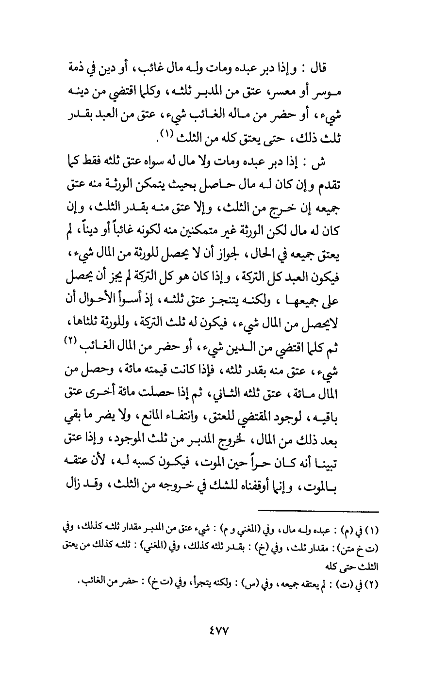 قال: وإذا دبر عبده ومات وله مال غائب، أو دين في ذمة موسر أو معسر، عتق من المدبر ثلثه، وكلما اقتضي من دينه شيء، أو حضر من ماله الغائب شيء، عتق من العبد بقدر ثلث ذلك، حتى يعتق كله من الثلث.