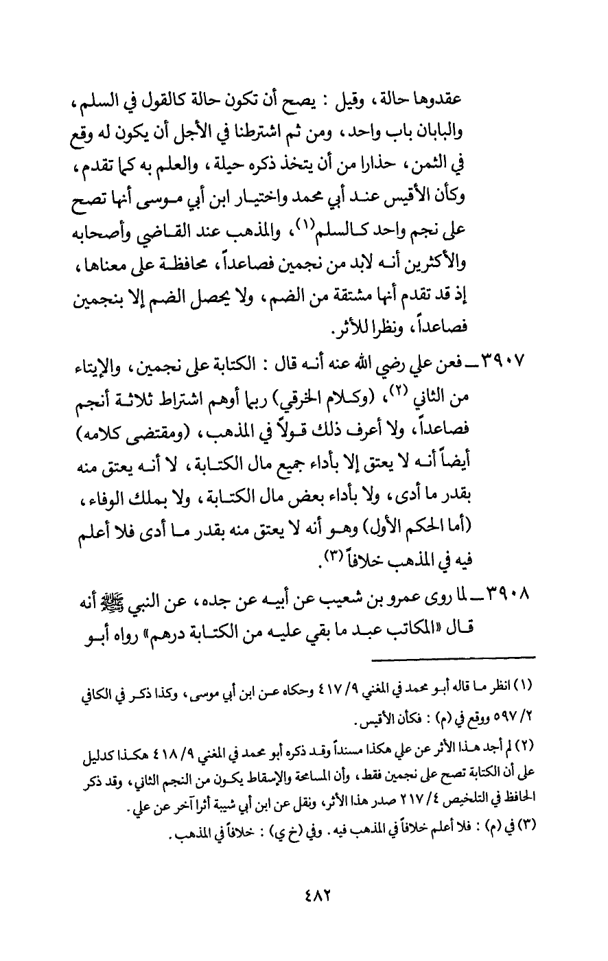 3907 - فعن علي - رَضِيَ اللَّهُ عَنْهُ - أنه قال: الكتابة على نجمين، والإيتاء من الثاني، (وكلام الخرقي) ربما أوهم اشتراط ثلاثة أنجم فصاعدا، ولا أعرف ذك قولا في المذهب، (ومقتضى كلامه) أيضا أنه لا يعتق إلا بأداء جميع مال الكتابة، لا أنه يعتق منه بقدر ما أدى، ولا بأداء بعض مال الكتابة، ولا بملك الوفاء، (أما الحكم الأول) وهو أنه لا يعتق منه بقدر ما أدى فلا أعلم فيه في المذهب خلافا.