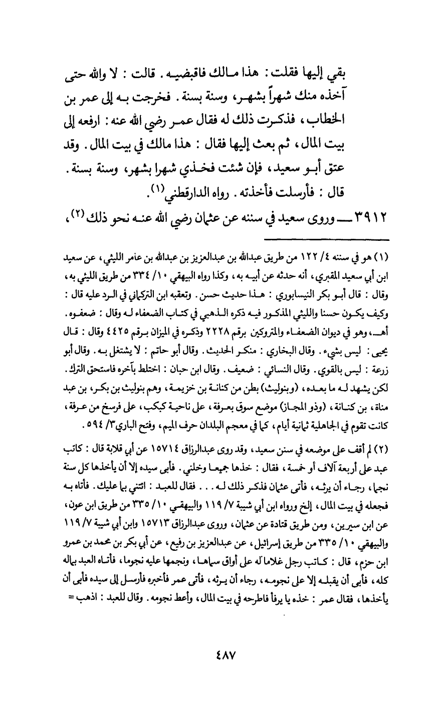 بقي إليها فقلت: هذا مالك فاقبضيه، قالت: لا والله حتى آخده منك شهرا بشهر، وسنة بسنة. فخرجت به إلى عمر بن الخطاب، فذكرت ذلك له فقال عمر - رَضِيَ اللَّهُ عَنْهُ -: ارفعه إلى بيت المال، ثم بعث إليها فقال: هذا مالك في بيت المال، وقد عتق أبو سعيد، فإن شئت فخذي شهرا بشهر، وسنة بسنة. قال: فأرسلت فأخذته، رواه الدارقطني.