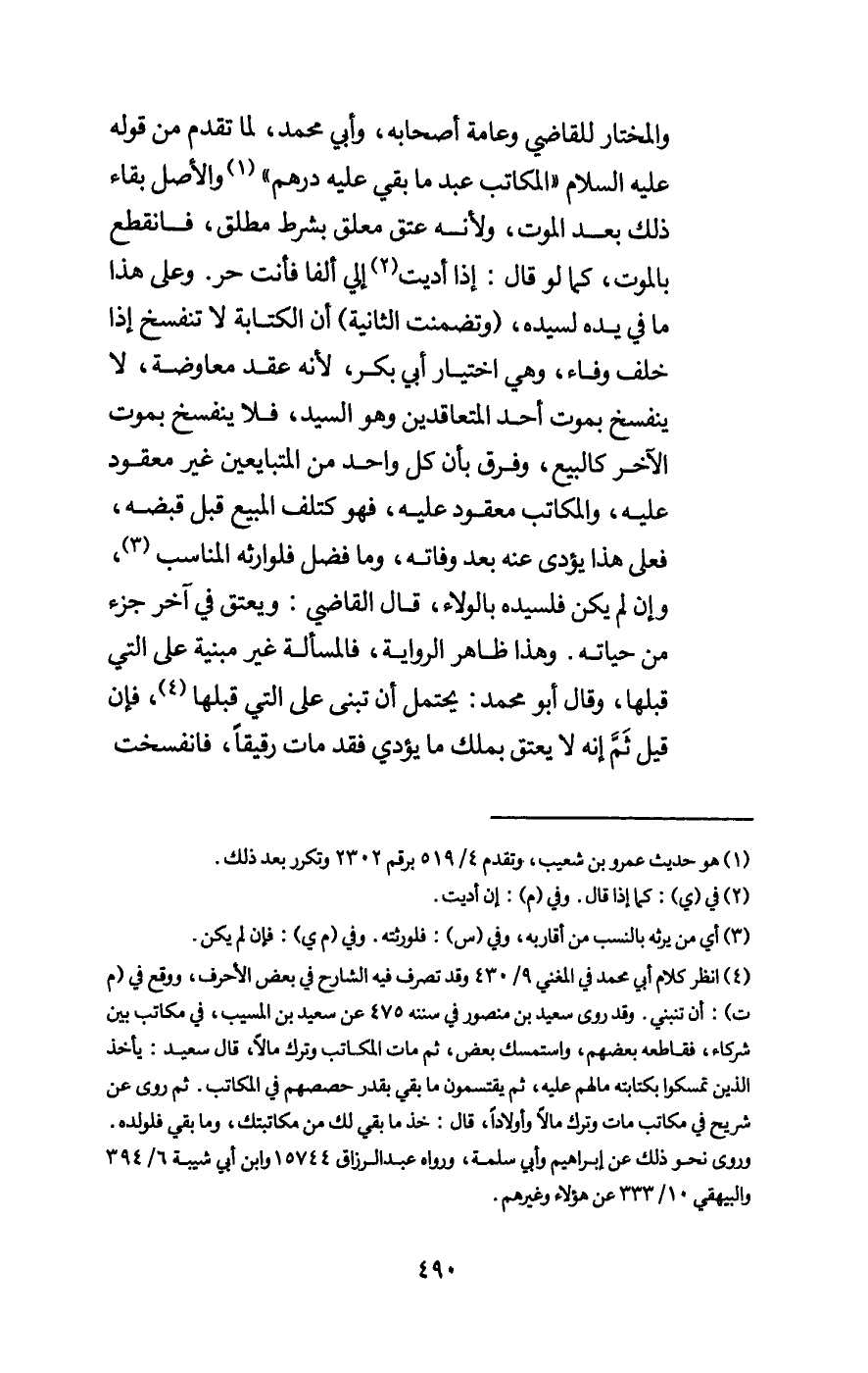والمختار للقاضي وعامة أصحابه، وأبي محمد، لما تقدم من قوله - عَلَيْهِ السَّلَامُ -: «المكاتب عبد ما بقي عليه درهم» والأصل بقاء ذلك بعد الموت، ولأنه عتق معلق بشرط مطلق، فانقطع بالموت، كما لو قال: إذا أديت إلي ألفا فأنت حر. وعلى هذا ما في يده لسيده، (وتضمنت الثانية) أن الكتابة لا تنفسخ إذا خلف وفاء، وهي اختيار أبي بكر، لأنه عقد معاوضة، لا ينفسخ بموت أحد المتعاقدين وهو السيد، فلا ينفسخ بموت الآخر كالبيع، وفرق بأن كل واحد من المتبايعين غير معقود عليه، والمكاتب معقود عليه، فهو كتلف المبيع قبل قبضه، فعلى هذا يؤدي عنه بعد وفاته، وما فضل فلوارثه المناسب، وإن لم يكن فلسيده بالولاء، قال القاضي: ويعتق في آخر جزء من حياته، وهذا ظاهر الرواية، فالمسألة غير مبنية على التي قبلها، وقال أبو محمد: يحتمل أن تبنى على التي قبلها، فإن قيل ثم إنه لا يعتق بملك ما يؤدي فقد مات رقيقا، فانفسخت