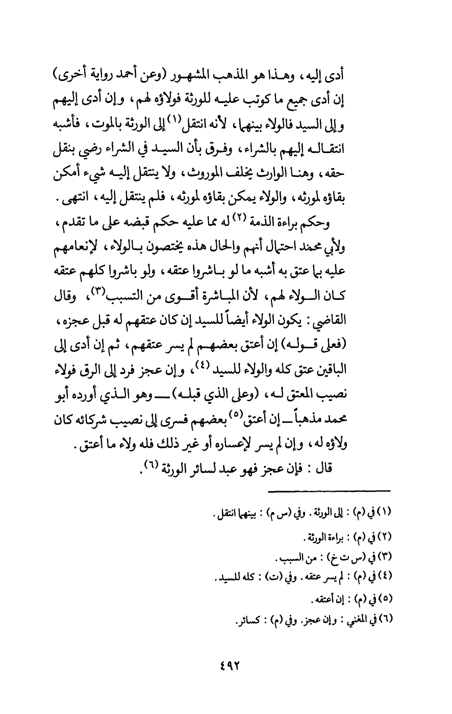 وحكم براءة الذمة له مما عليه حكم قبضه على ما تقدم، ولأبي محمد احتمال أنهم والحال هذه يختصون بالولاء، لإنعامهم عليه بما عتق به أشبه ما لو باشروا عتقه، ولو باشروا كلهم عتقه كان الولاء لهم، لأن المباشرة أقوى من التسبب، وقال القاضي: يكون الولاء أيضا للسيد إن كان عتقهم له قبل عجزه، (فعلى قوله) إن أعتق بعضهم لم يسر عتقهم، ثم إن أدى إلى الباقين عتق كله والولاء للسيد، وإن عجز فرد إلى الرق فولاء نصيب المعتق له، (وعلى الذي قبله) - وهو الذي أورده أبو محمد مذهبا - إن أعتق بعضهم فسرى إلى نصيب شركائه كان ولاؤه له، وإن لم يسر لإعساره أو غير ذلك فله ولاء ما أعتق.