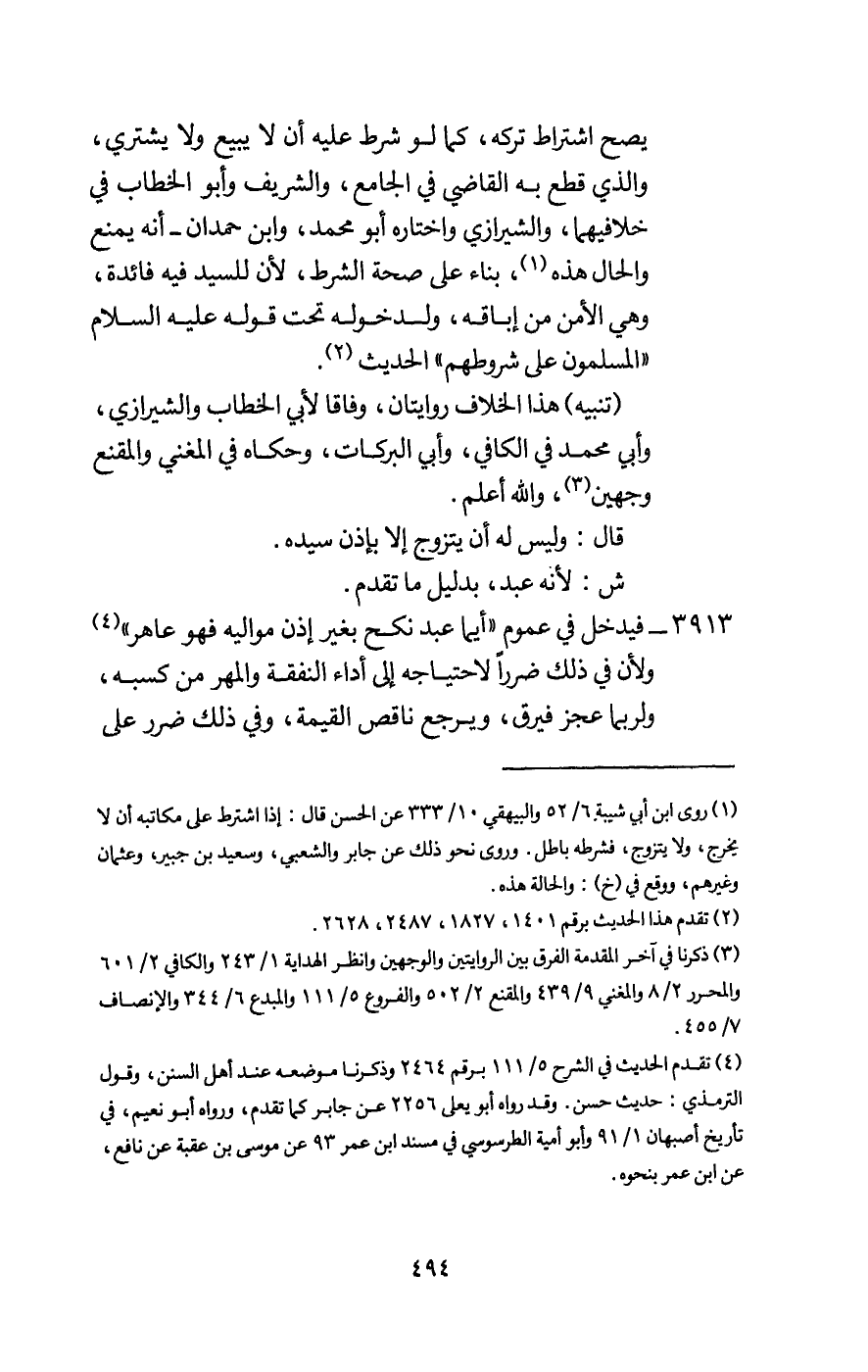 3913 - فيدخل في عموم «أيما عبد نكح بغير إذن مواليه فهو عاهر» ولأن في ذلك ضررا لاحتياجه إلى أداء النفقة والمهر من كسبه، ولربما عجز فيرق، ويرجع ناقص القيمة، وفي ذلك ضرر على
