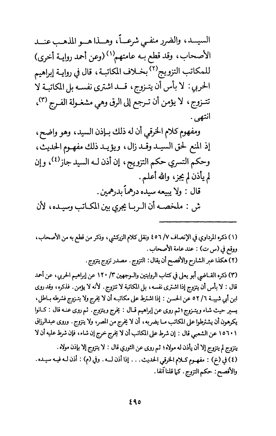 السيد، والضرر منفي شرعا، وهذا هو المذهب عند الأصحاب، وقد قطع به عامتهم (وعن أحمد رواية أخرى) للمكاتب التزويج بخلاف المكاتبة، قال في رواية إبراهيم الحربي: لا بأس أن يتزوج، قد اشترى نفسه بل المكاتبة لا تتزوج، لا يؤمن أن ترجع إلى الرق وهي مشغولة الفرج، انتهى.