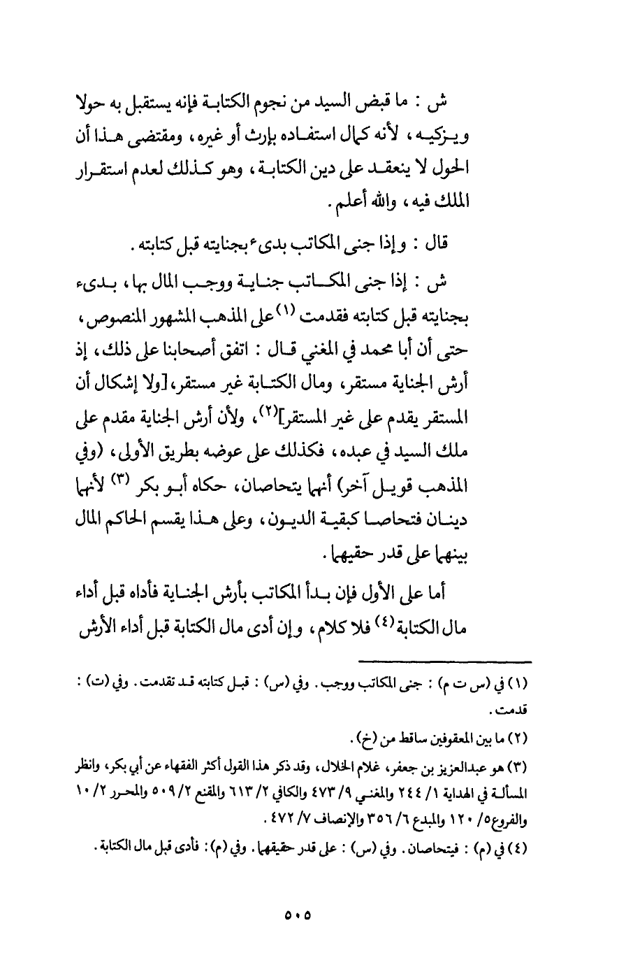 ش: ما قبض السيد من نجوم الكتابة فإنه يستقبل به حولا ويزكيه لأنه كمال استفاده بإرث أو غيره، ومقتضى هذا أن الحول لا ينعقد على دين الكتابة، وهو كذلك لعدم استقرار الملك فيه، والله أعلم.