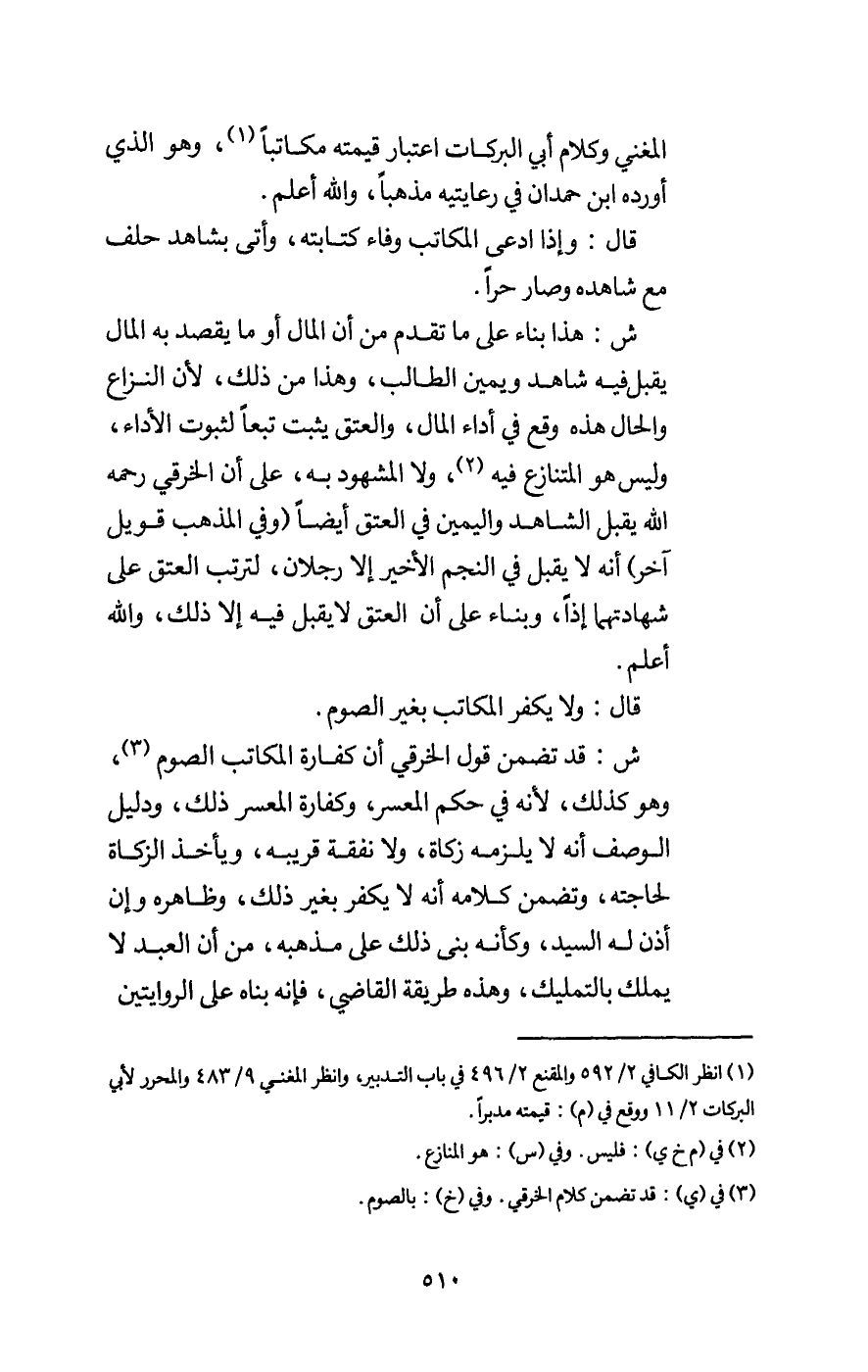 ش: هذا بناء على ما تقدم من أن المال أو ما يقصد به المال يقبل فيه شاهد ويمين الطالب، وهذا من ذلك، لأن النزاع والحال هذه وقع في أداء المال، والعتق يثبت تبعا لثبوت الأداء، وليس هو المتنازع فيه، ولا المشهود به، على أن الخرقي - رَحِمَهُ اللَّهُ - يقبل الشاهد واليمين في العتق أيضا (وفي المذهب قويل آخر) أنه لا يقبل في النجم الأخير إلا رجلان، لترتب العتق على شهادتهما إذا، وبناء على أن العتق لا يقبل فيه إلا ذلك، والله أعلم.