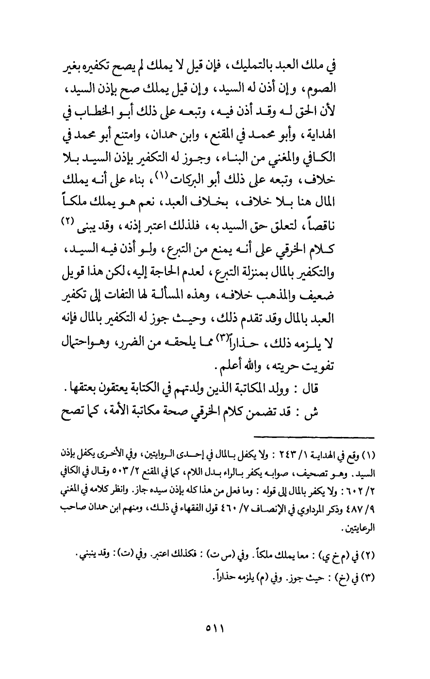 في ملك العبد بالتمليك، فإن قيل لا يملك لم يصح تكفيره بغير الصوم، وإن أذن له السيد، وإن قيل يملك صح بإذن السيد، لأن الحق له وقد أذن فيه، وتبعه على ذلك أبو الخطاب في الهداية، وأبو محمد في المقنع، وابن حمدان، وامتنع أبو محمد في الكافي والمغني من البناء، وجوز له التكفير بإذن السيد بلا خلاف، وتبعه على ذلك أبو البركات، بناء على أنه يملك المال هنا بلا خلاف. بخلاف العبد، نعم هو يملك ملكا ناقصا، لتعلق حق السيد به، فلذلك اعتبر إذنه، وقد يبنى كلام الخرقي على أنه يمنع من التبرع، ولو أذن فيه السيد، والتكفير بالمال بمنزلة التبرع، لعدم الحاجة إليه، لكن هذا قويل ضعيف والمذهب خلافه، وهذه المسألة لها التفات إلى تكفير العبد بالمال وقد تقدم ذلك، وحيث جوز له التكفير بالمال فإنه لا يلزمه ذلك، حذارا مما يلحقه من الضرر، وهو احتمال تفويت حريته، والله أعلم.