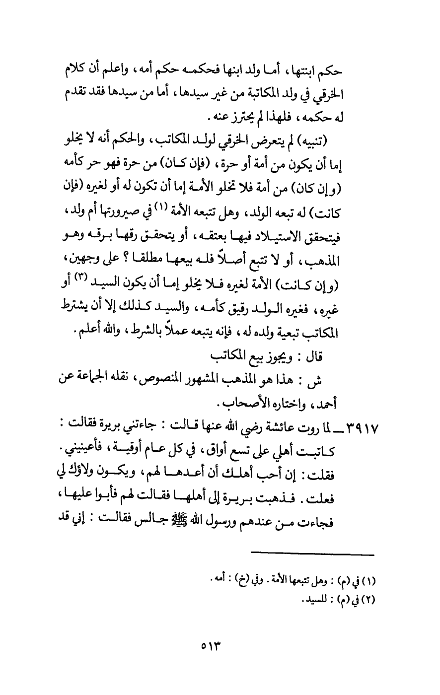(تنبيه) لم يتعرض الخرقي لولد المكاتب، والحكم أنه لا يخلو إما أن يكون من أمة أو حرة، (فإن كان) من حرة فهو حر كأمه (وإن كان) من أمة فلا تخلو الأمة إما أن تكون له أو لغيره (فإن كانت) له تبعه الولد، وهل تتبعه الأمة في صيرورتها أم ولد، فيتحقق الاستيلاد فيها بعتقه، أو يتحقق رقها برقه وهو المذهب، أو لا تتبع أصلا فله بيعها مطلقا؟ على وجهين، (وإن كانت) الأمة لغيره فلا يخلو إما أن يكون السيد أو غيره، فغيره الولد رقيق كأمه، والسيد كذلك إلا أن يشترط المكاتب تبعية ولده له، فإنه يتبعه عملا بالشرط، والله أعلم.