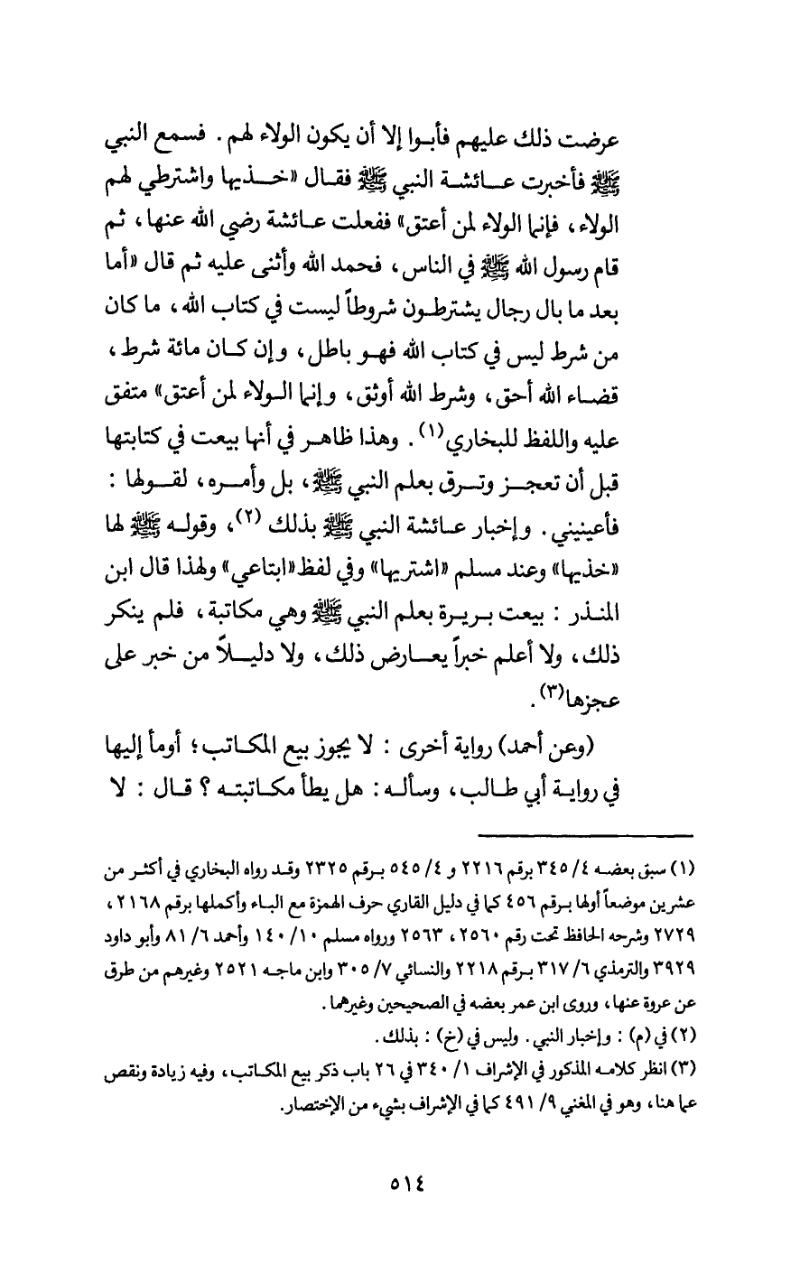 عرضت ذلك عليهم فأبوا إلا أن يكون الولاء لهم، فسمع النبي - صَلَّى اللَّهُ عَلَيْهِ وَسَلَّمَ - فأخبرت عائشة النبي - صَلَّى اللَّهُ عَلَيْهِ وَسَلَّمَ - فقال: «خذيها واشترطي لهم الولاء، فإنما الولاء لمن أعتق» ففعلت عائشة - رَضِيَ اللَّهُ عَنْهَا -، ثم قام رسول الله - صَلَّى اللَّهُ عَلَيْهِ وَسَلَّمَ - في الناس، فحمد الله وأثنى عليه ثم قال: «أما بعد ما بال رجال يشترطون شروطا ليست في كتاب الله، ما كان من شرط ليس في كتاب الله فهو باطل، وإن كان مائة شرط، قضاء الله أحق، وشرط الله أوثق، وإنما الولاء لمن أعتق» » متفق عليه واللفظ للبخاري. وهذا ظاهر في أنها بيعت في كتابتها قبل أن تعجز وترق بعلم النبي - صَلَّى اللَّهُ عَلَيْهِ وَسَلَّمَ -، بل وأمره لقولها: فأعينيني، وإخبار عائشة النبي - صَلَّى اللَّهُ عَلَيْهِ وَسَلَّمَ - بذلك، وقوله - صَلَّى اللَّهُ عَلَيْهِ وَسَلَّمَ - لها: «خذيها» وعند مسلم: «اشتريها» وفي لفظ: «ابتاعي» ولهذا قال ابن المنذر: بيعت بريرة بعلم النبي - صَلَّى اللَّهُ عَلَيْهِ وَسَلَّمَ - وهي مكاتبة، فلم ينكر ذلك، ولا أعلم خبرا يعارض ذلك، ولا دليلا من خبر على عجزها.