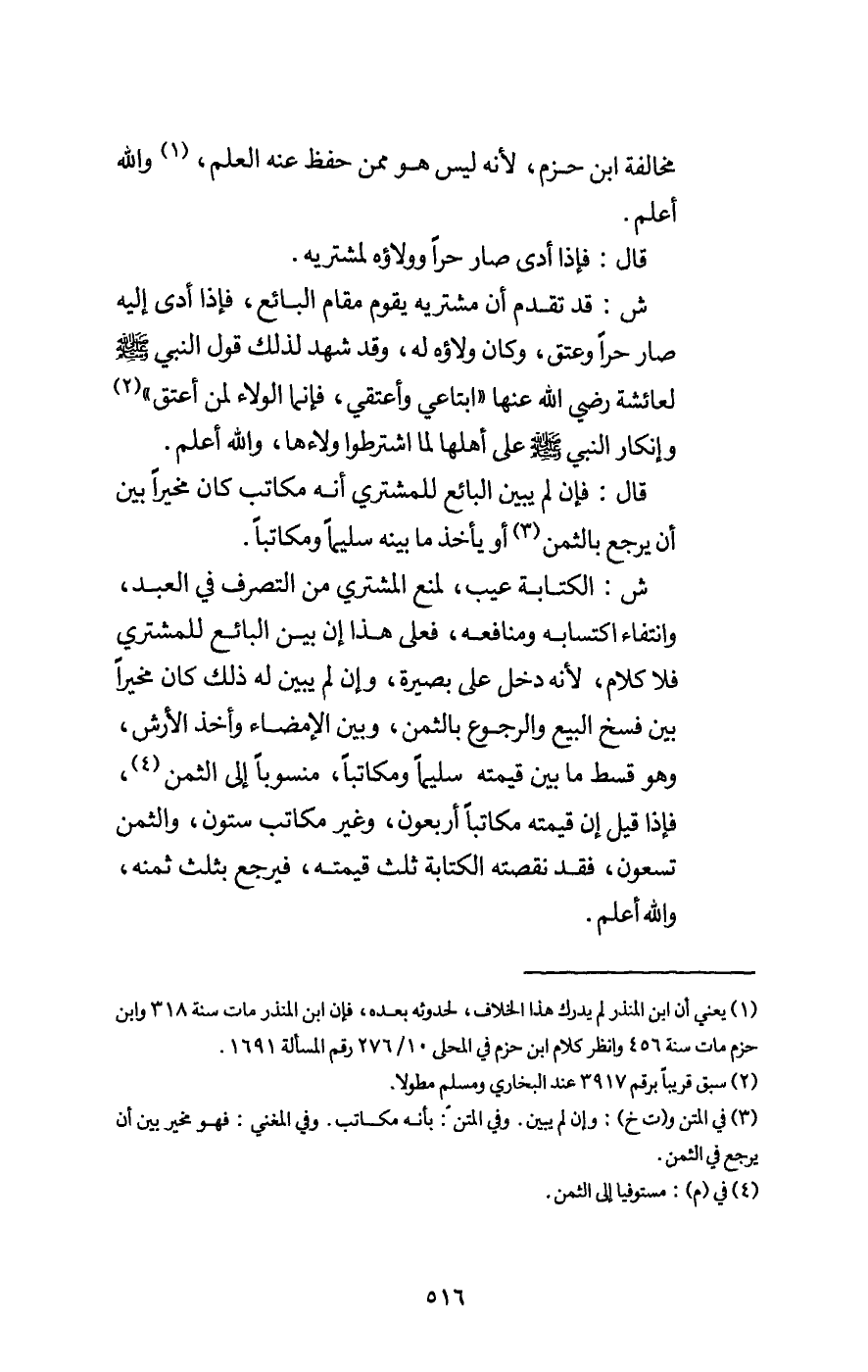 ش: قد تقدم أن مشتريه يقوم مقام البائع، فإذا أدى إليه صار حرا وعتق، وكان ولاؤه له، وقد شهد لذلك قول النبي - صَلَّى اللَّهُ عَلَيْهِ وَسَلَّمَ - لعائشة - رَضِيَ اللَّهُ عَنْهَا -: «ابتاعي وأعتقي، فإنما الولاء لمن أعتق» وإنكار النبي - صَلَّى اللَّهُ عَلَيْهِ وَسَلَّمَ - على أهلها لما اشترطوا ولاءها، والله أعلم.