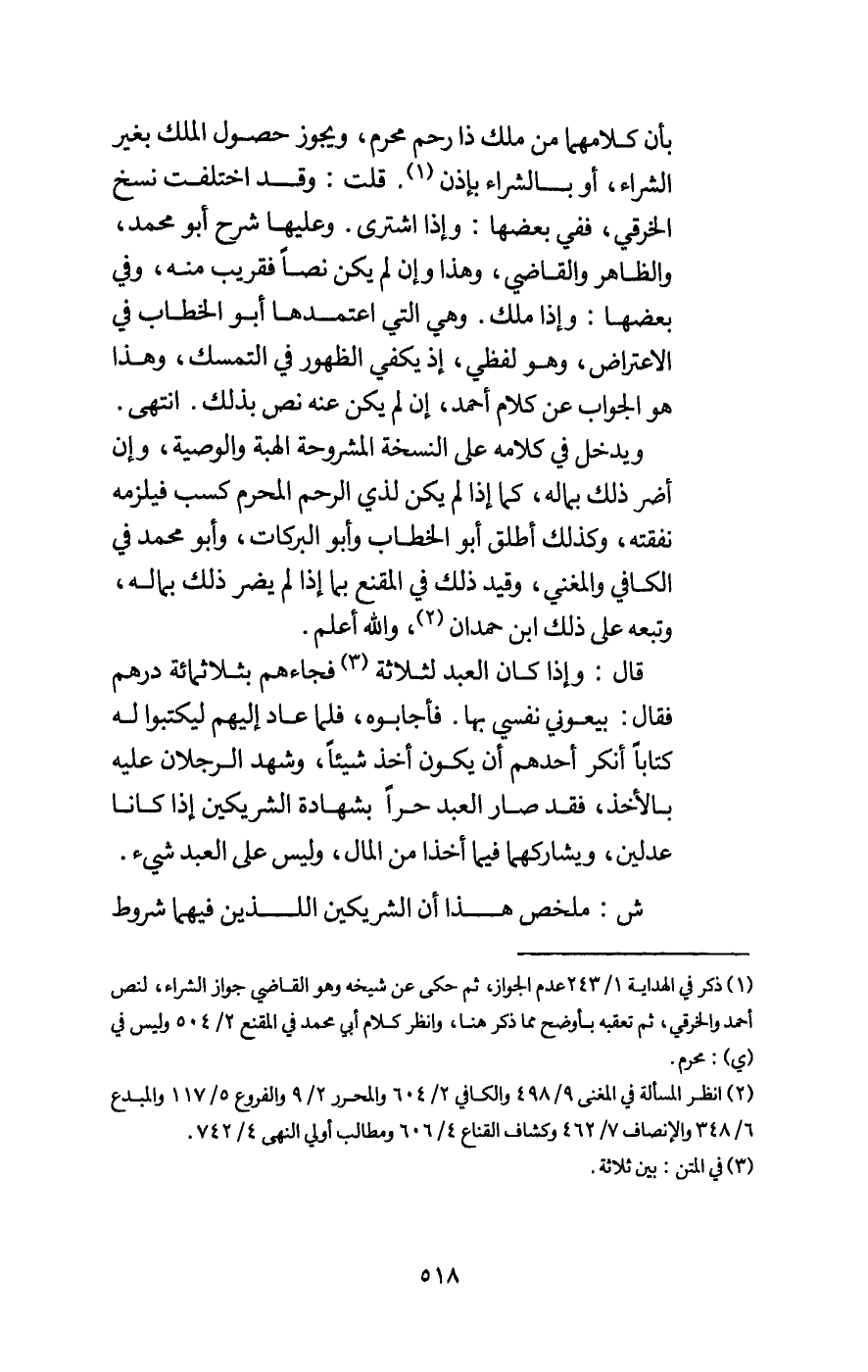 بأن كلامهما من ملك ذا رحم محرم، ويجوز حصول الملك بغير الشراء، أو بالشراء بإذن. قلت: وقد اختلفت نسخ الخرقي، ففي بعضها: وإذا اشترى. وعليها شرح أبو محمد، والظاهر والقاضي، وهذا وإن لم يكن نصا فقريب منه، وفي بعضها: وإذا ملك. وهي التي اعتمدها أبو الخطاب في الاعتراض، وهو لفظي، إذ يكفي الظهور في التمسك، وهذا هو الجواب عن كلام أحمد، إن لم يكن عنه نص بذلك. انتهى.