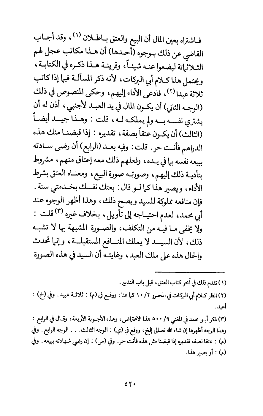 فاشتراه بعين المال أن البيع والعتق باطلان، وقد أجاب القاضي عن ذلك بوجوه (أحدها) أن هذا مكاتب عجل لهم الثلاثمائة ليضعوا عنه شيئا، وقرينة هذا ذكره في الكتابة، ويحتمل هذا كلام أبي البركات، لأنه ذكر المسألة فيما إذا كاتب ثلاثة عبدا، فادعى الأداء إليهم، وحكى المنصوص في ذلك (الوجه الثاني) أن يكون المال في يد العبد الأجنبي، أذن له أن يشتري نفسه به ولم يملكه له، قلت: وهذا جيد أيضا (الثالث) أن يكون عتقا بصفة، تقديره: إذا قبضنا منك هذه الدراهم فأنت حر. قلت: وفيه بعد (الرابع) أن رضى سادته ببيعه نفسه بما في يده، وفعلهم ذلك معه إعتاق منهم، مشروط بتأدية ذلك إليهم، وصورته صورة البيع، ومعناه العتق بشرط الأداء، ويصير هذا كما لو قال: بعتك نفسك بخدمتي سنة. فإن منافعه مملوكة للسيد ويصح ذلك، وهذا أظهر الوجوه عند أبي محمد، لعدم احتياجه إلى تأويل، بخلاف غيره، قلت: ولا يخفى ما فيه من التكلف، والصورة المشبهة بها لا تشبه ذلك، لأن السيد لا يملك المنافع المستقبلة، وإنما تحدث والحال هذه على ملك العبد، وغايته أن السيد في هذه الصورة