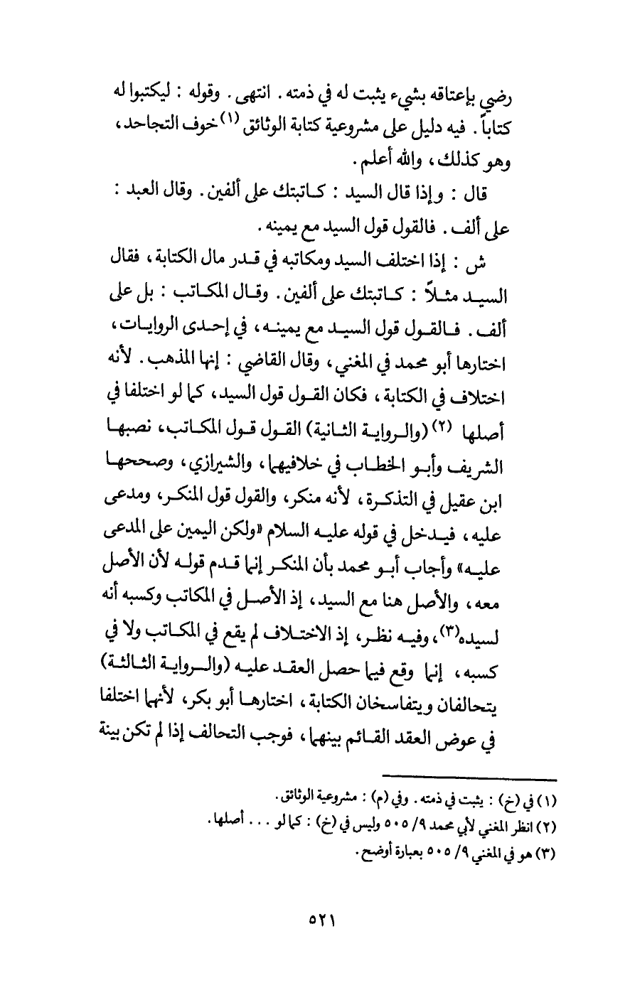 ش: إذا اختلف السيد ومكاتبه في قدر مال الكتابة، فقال السيد مثلا، كاتبتك على ألفين، وقال المكاتب: بل على ألف. فالقول قول السيد مع يمينه، في إحدى الروايات، اختارها أبو محمد، في المغني، وقال القاضي: إنها المذهب. لأنه اختلاف في الكتابة، فكان القول قول السيد، كما لو اختلفا في أصلها (والرواية الثانية) القول قول المكاتب، نصبها الشريف وأبو الخطاب في خلافيهما، والشيرازي، وصححها ابن عقيل في التذكرة، لأنه منكر، والقول قول المنكر، ومدعى عليه، فيدخل في قوله - عَلَيْهِ السَّلَامُ -: «ولكن اليمين على المدعى عليه» وأجاب أبو محمد بأن المنكر إنما قدم قوله لأن الأصل معه، والأصل هنا مع السيد، إذ الأصل في المكاتب وكسبه أنه لسيده، وفيه نظر، إذ الاختلاف لم يقع في المكاتب ولا في كسبه، إنما وقع فيما حصل العقد عليه (والرواية الثالثة) يتحالفان ويتفاسخان الكتابة، اختارها أبو بكر، لأنهما اختلفا في عوض العقد القائم بينهما، فوجب التحالف إذا لم تكن بينة