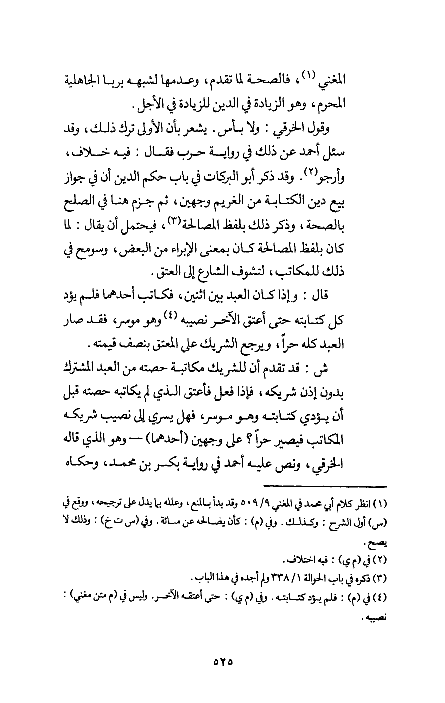 المغني، فالصحة لما تقدم، وعدمها لشبهه بربا الجاهلية المحرم، وهو الزيادة في الدين للزيادة في الأجل. وقول الخرقي: ولا بأس. يشعر بأن الأولى ترك ذلك، وقد سئل أحمد عن ذلك في رواية حرب فقال: فيه خلاف، وأرجو. وقد ذكر أبو البركات في باب حكم الدين أن في جواز بيع دين الكتابة من الغريم وجهين، ثم جزم هنا في الصلح بالصحة، وذكر ذلك بلفظ المصالحة، فيحتمل أن يقال: لما كان بلفظ المصالحة كان بمعنى الإبراء من البعض، وسومح في ذلك للمكاتب، لتشوف الشارع إلى العتق.