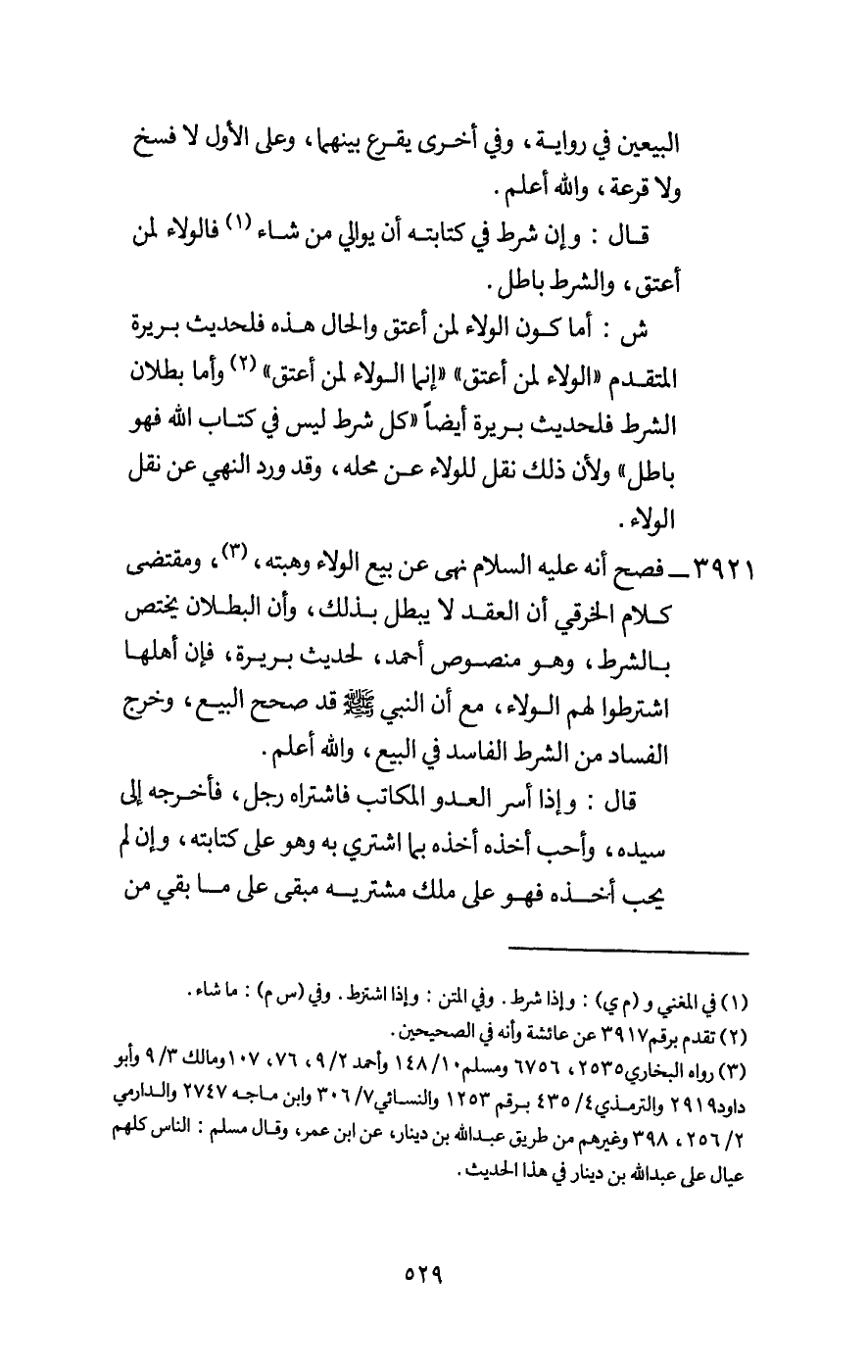 3921 - فصح «أنه - عَلَيْهِ السَّلَامُ - نهى عن بيع الولاء وهبته» ، ومقتضى كلام الخرقي أن العقد لا يبطل بذلك، وأن البطلان يختص بالشرط، وهو منصوص أحمد، لحديث بريرة، فإن أهلها اشترطوا لهم الولاء، مع أن النبي - صَلَّى اللَّهُ عَلَيْهِ وَسَلَّمَ - قد صحح البيع، وخرج الفساد من الشرط الفاسد في البيع، والله أعلم.