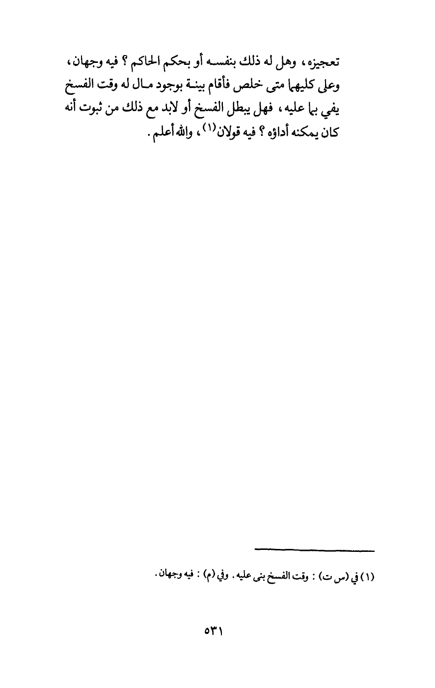 تعجيزه، وهل له ذلك بنفسه أو بحكم الحاكم؟ فيه وجهان، وعلى كليهما متى خلص فأقام بينة بوجود مال له وقت الفسخ يفي بما عليه، فهل يبطل الفسخ أو لا بد مع ذلك من ثبوت أنه كان يمكنه أداؤه؟ فيه قولان، والله أعلم.
