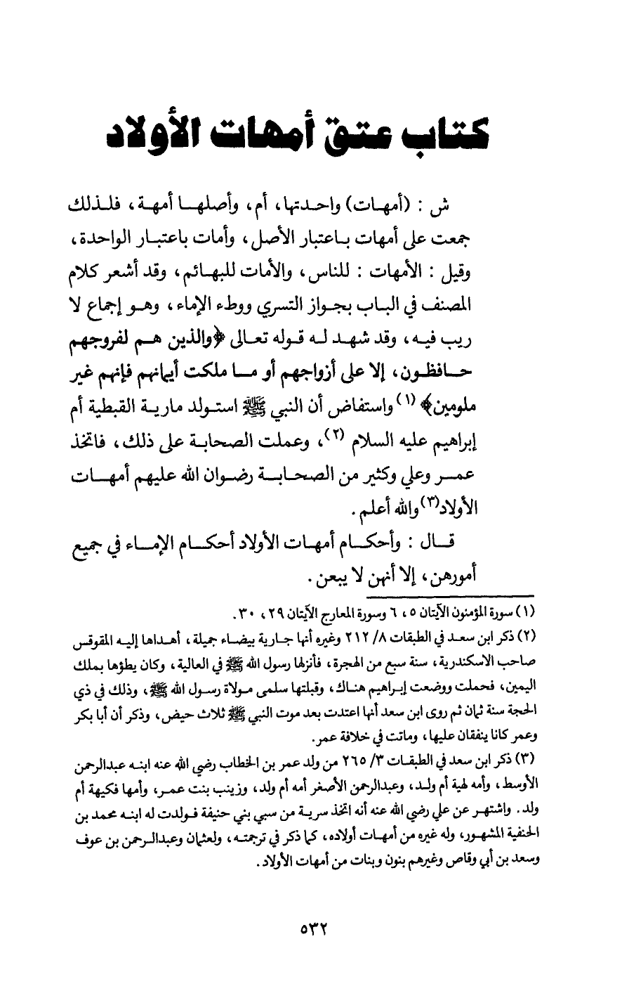 ش: (أمهات) واحدتها، أم، وأصلها أمهة، فلذلك جمعت على أمهات باعتبار الأصل، وأمات باعتبار الواحدة، وقيل: الأمهات: للناس، والأمات للبهائم، وقد أشعر كلام المصنف في الباب بجواز التسري ووطء الإماء، وهو إجماع لا ريب فيه، وقد شهد له قَوْله تَعَالَى: {وَالَّذِينَ هُمْ لِفُرُوجِهِمْ حَافِظُونَ - إِلَّا عَلَى أَزْوَاجِهِمْ أوْ مَا مَلَكَتْ أَيْمَانُهُمْ فَإِنَّهُمْ غَيْرُ مَلُومِينَ} [المؤمنون: 5 - 6] واستفاض أن النبي - صَلَّى اللَّهُ عَلَيْهِ وَسَلَّمَ - استولد مارية القبطية أم إبراهيم - عَلَيْهِ السَّلَامُ -، وعملت الصحابة على ذلك، فاتخذ عمر وعلي وكثير من الصحابة - رِضْوَانُ اللَّهِ عَلَيْهِمْ - أمهات الأولاد والله أعلم.