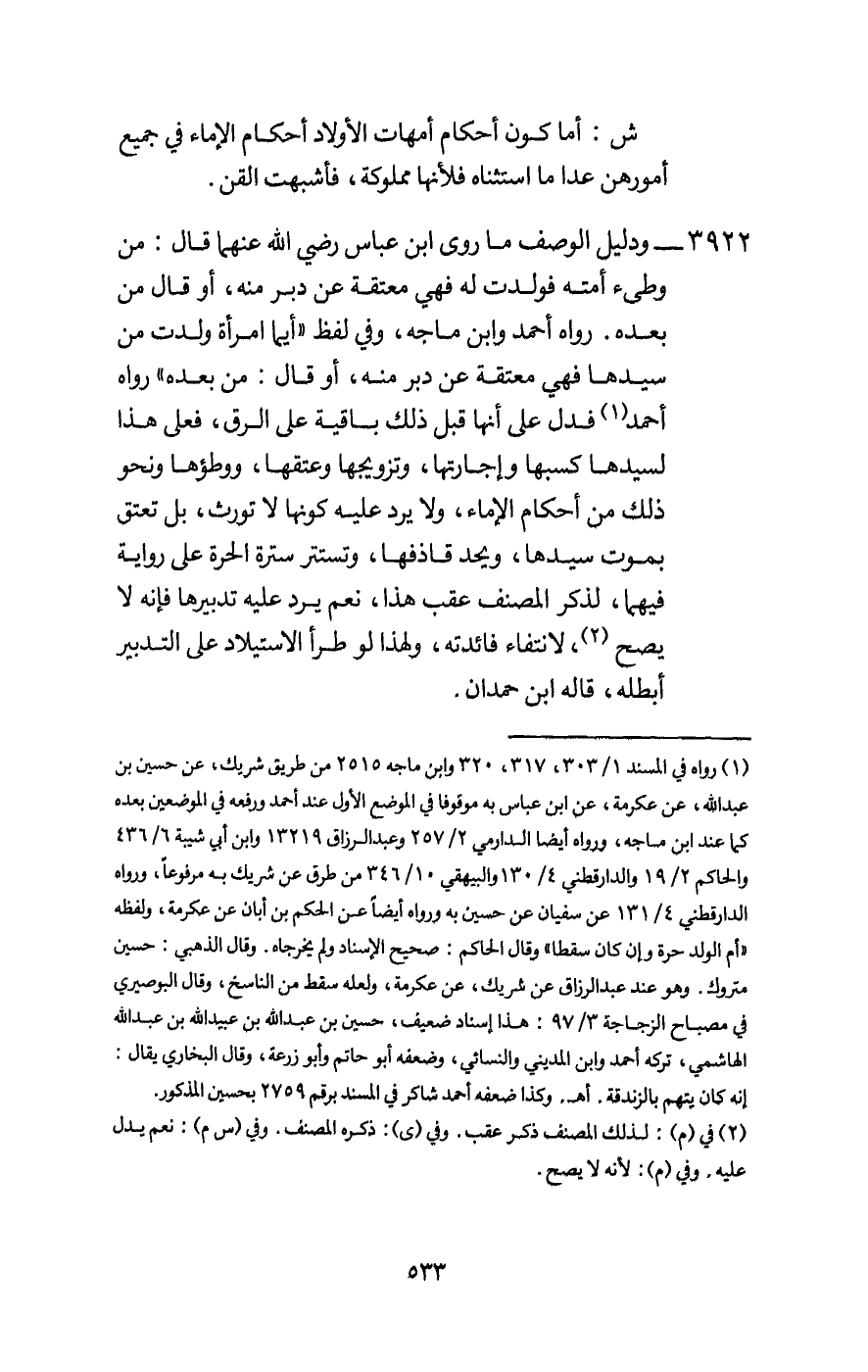 3922 - ودليل الوصف ما روى ابن عباس - رَضِيَ اللَّهُ عَنْهُمَا - قال: «من وطئ أمته فولدت له فهي معتقة عن دبر منه، أو قال من بعده» . رواه أحمد وابن ماجه، وفي لفظ: «أيما امرأة ولدت من سيدها فهي معتقة عن دبر منه، أو قال: من بعده» رواه أحمد فدل على أنها قبل ذلك باقية على الرق، فعلى هذا لسيدها كسبها وإجارتها، وتزويجها وعتقها، ووطؤها ونحو ذلك من أحكام الإماء، ولا يرد عليه كونها لا تورث، بل تعتق بموت سيدها، ويحد قاذفها، وتستتر سترة الحرة على رواية فيهما، لذكر المصنف عقب هذا، نعم يرد عليه تدبيرها فإنه لا يصح، لانتفاء فائدته، ولهذا لو طرأ الاستيلاد على التدبير أبطله، قاله ابن حمدان.