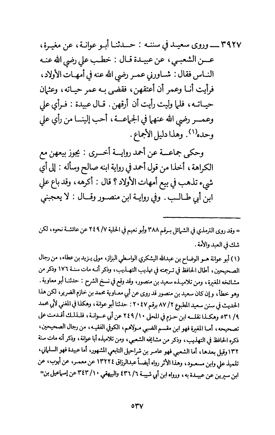 3927 - وروى سعيد في سننه: حدثنا أبو عوانة، عن مغيرة عن الشعبي، عن عبيدة قال: خطب علي - رَضِيَ اللَّهُ عَنْهُ - الناس فقال: شاورني عمر - رَضِيَ اللَّهُ عَنْهُ - في أمهات الأولاد، فرأيت أنا وعمر أن أعتقهن، فقضى به عمر حياته، وعثمان حياته، فلما وليت رأيت أن أرقهن. قال عبيدة: فرأي علي وعمر - رَضِيَ اللَّهُ عَنْهُمَا - في الجماعة، أحب إلينا من رأي علي وحده. وهذا دليل الإجماع. وحكى جماعة عن أحمد رواية أخرى: يجوز بيعهن مع الكراهة، أخذا من قول أحمد في رواية ابنه صالح وسأله: إلى أي شيء تذهب في بيع أمهات الأولاد؟ قال: أكرهه، وقد باع علي بن أبي طالب. وفي رواية ابن منصور وقال: لا يعجبني